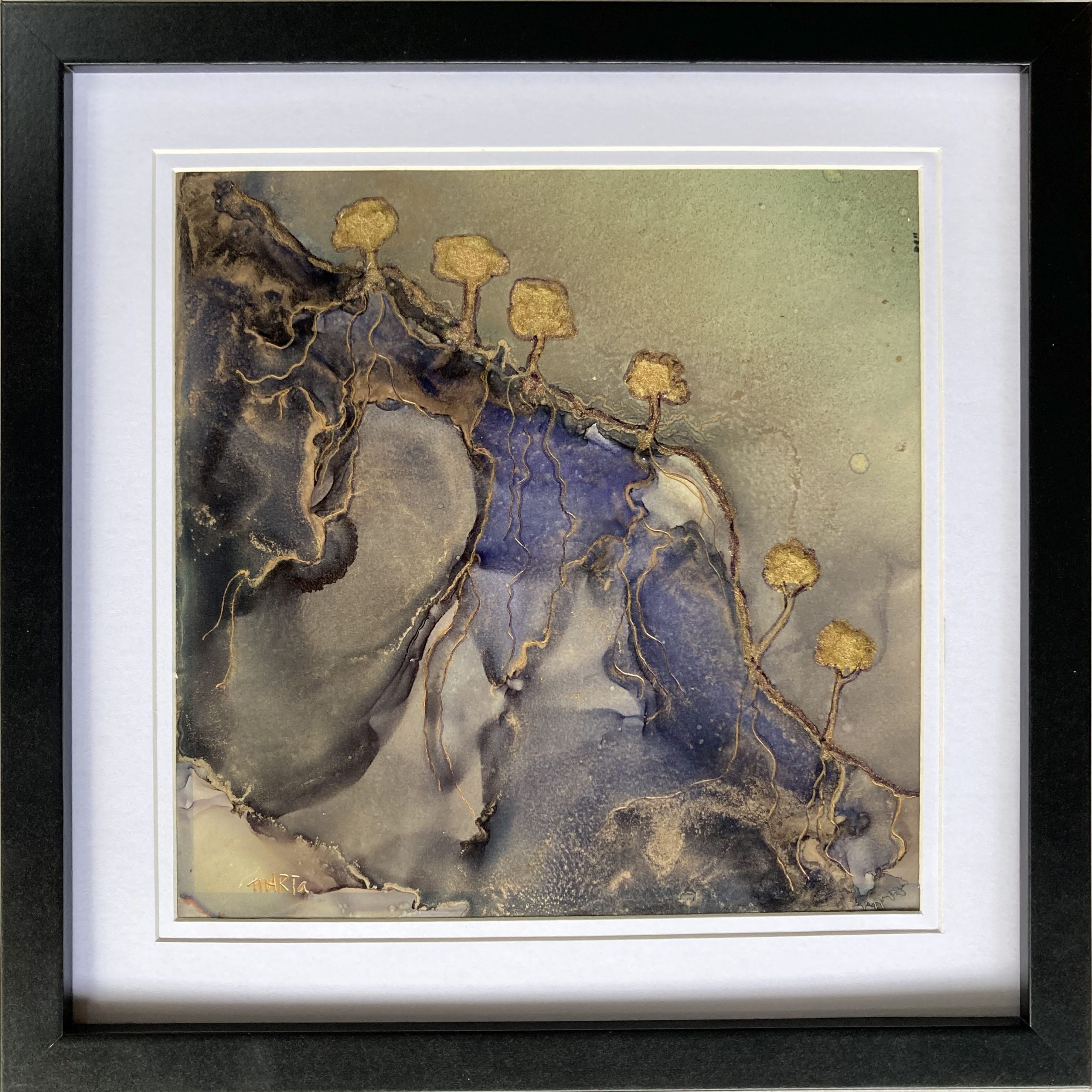 ‘Up The Hill’ by Marta Blaszak – is an Alcohol Ink painting on 22cm x 22cm Yupo Paper. It is framed with a black 28cm x 28cm frame with a white mat behind glass. A hanging wire is attached to the back so it can be hung immediately. Art Lovers also offers a professional Framing Service if desired. The Hoverlay image shows the supplied frame.