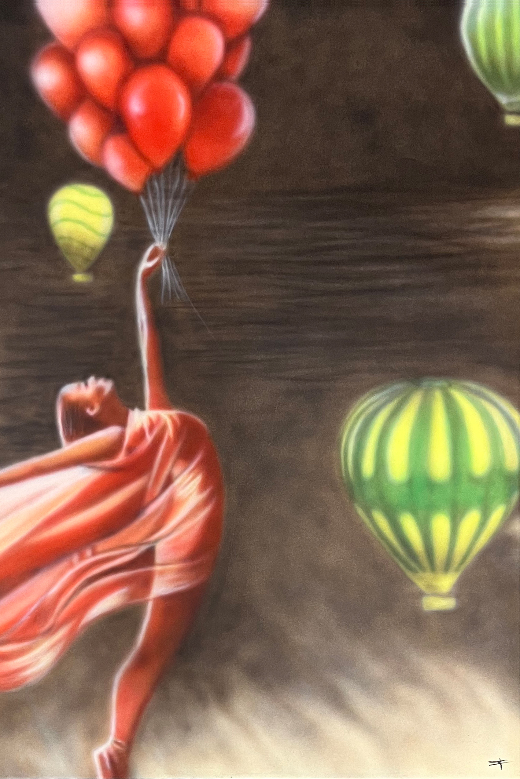 “Uplifting” was created with layers of ink airbrushed on MDF Board. Many people suffer from depression, anxiety and many other conditions caused by this modern world and this painting signifies being lifted up out of the darkness into a world of clarity.