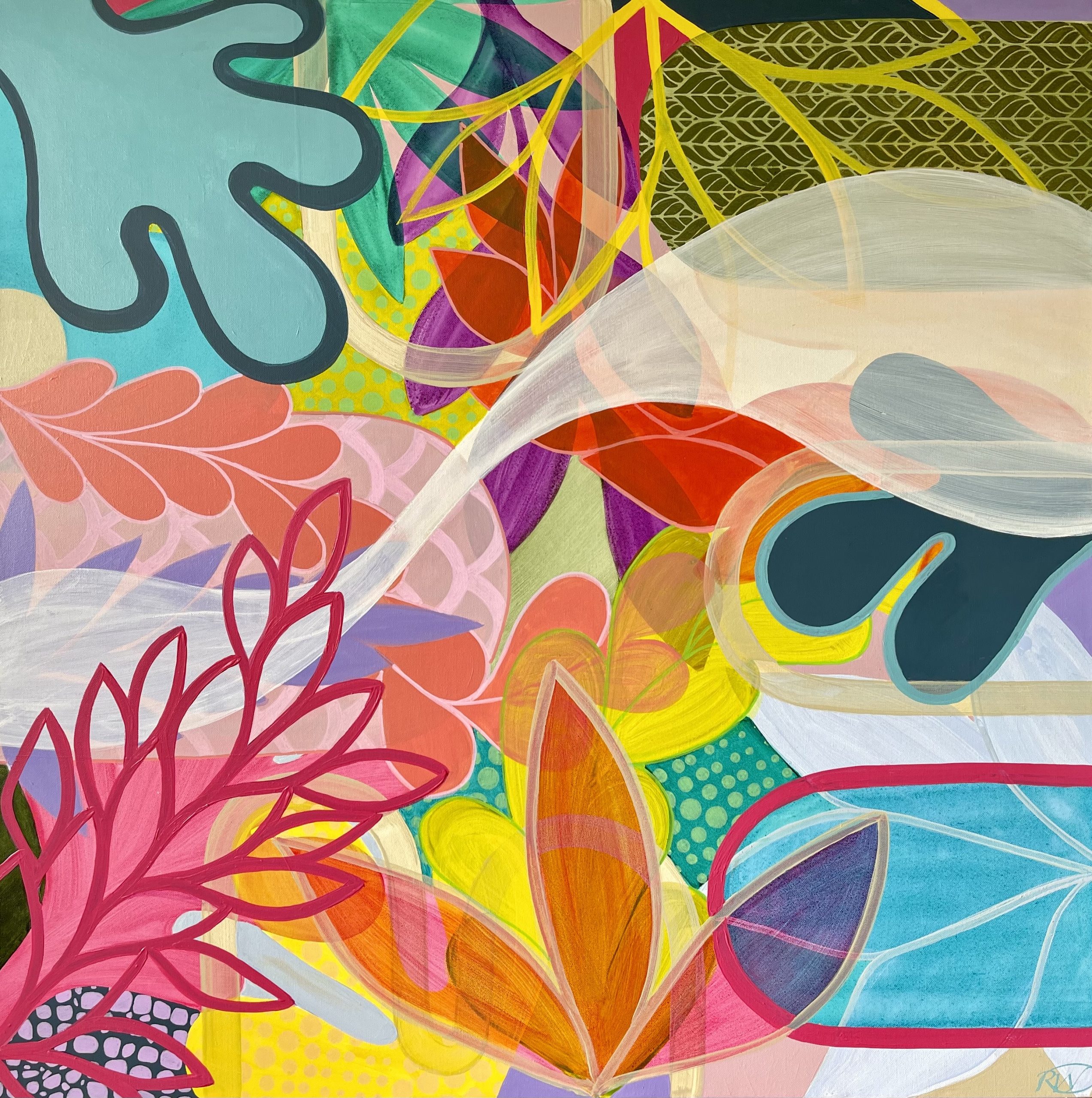 This large colourful artwork was inspired by nature and organic shape. It was produced through the layering of transparent and opaque hues. The vibrancy of colour adds to the aesthetic appeal in the work and communicates a feeling of joy. A sense of direction has been achieved with the addition of a horizontal white line traveling across the work in a wave like motion. This large scale artwork would suit any contemporary home adding a pop of joyful colour into your space.