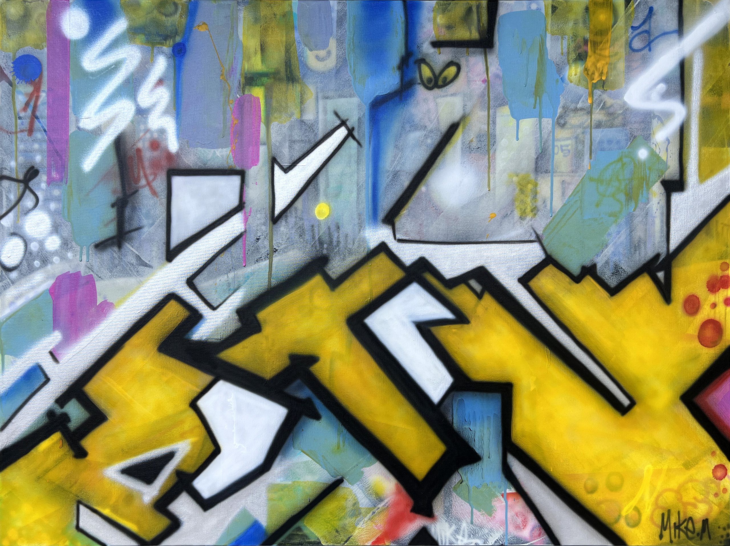 Inspired by the walls of the buildings in and around Prahran Victoria, Urban Abstract – Painted in McHugh’s Trentham studio. Blending modern technology with traditional art, the creative journey begins with a carefully crafted prompt that leads to a reference image generated using AI. This image is then skillfully drawn onto a canvas, with the artist making thoughtful adjustments to enhance the piece. The final work is an airbrushed painting, using acrylic paints on Canvas. This is a one of kind original artwork, that is highlighted with the use of metallic silver paint in areas.
