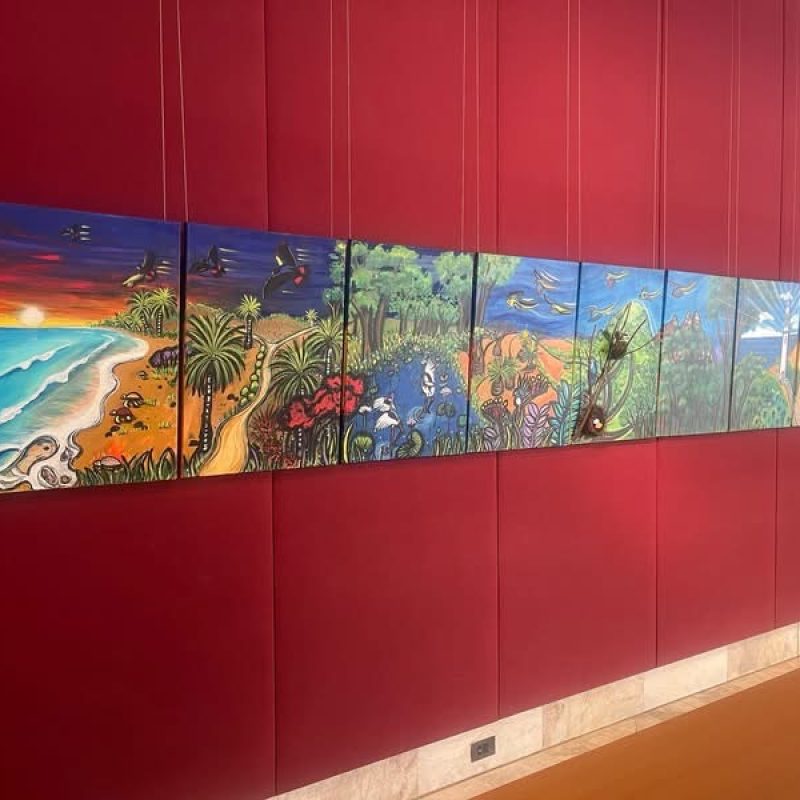 This piece reflects my past. As a child if the 70’s I remember all the interiors in so many different houses. Especially plants/vines that were hung from the ceilings. Theses colours really stood out more than others. Urban Melbourne represents my past and the memories I have of colourful interiors in city buildings, houses and apartments. I loved every moment of this painting.