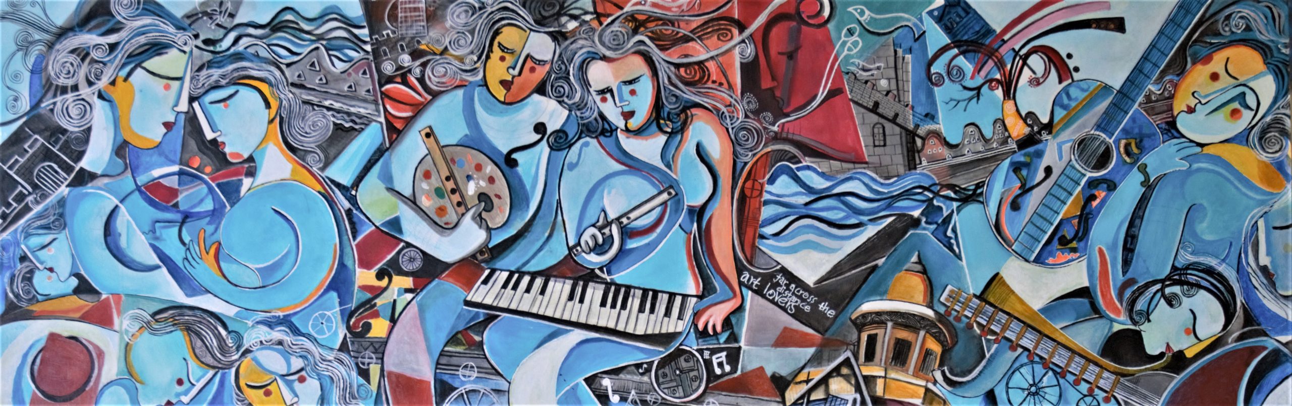 Urban Scenes by Mahesh Aluthge – Abstract couples painting who obsessed with music and paintings is the basic theme for this painting. From the Legacy of ancient city to a contemporary age music, visual arts and romance blend together with blue color base in a unique way.