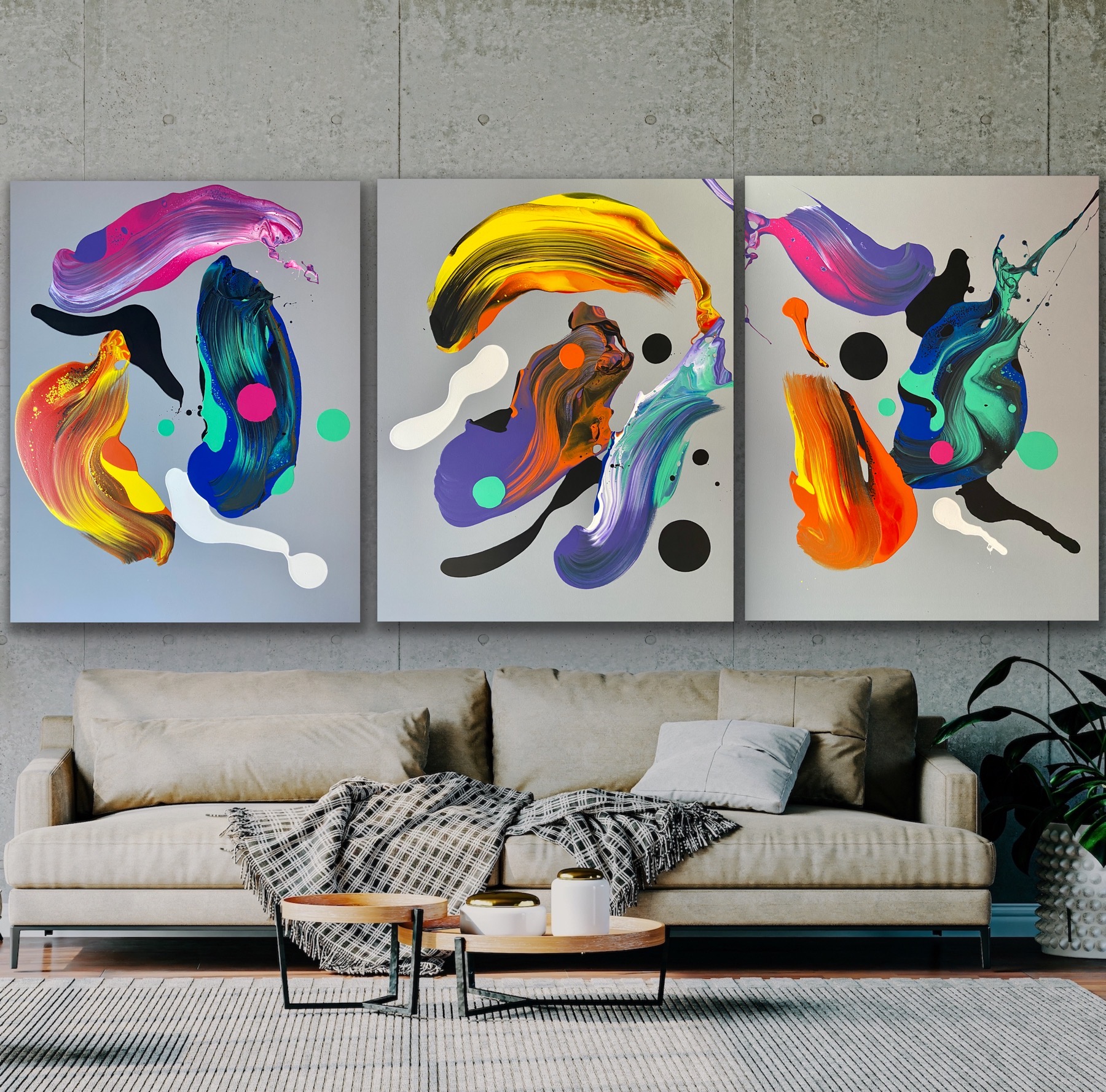 Measures 240cm x100cm as a 3 piece set, custom gallery quality stretched extra thick 5cm edge canvas.