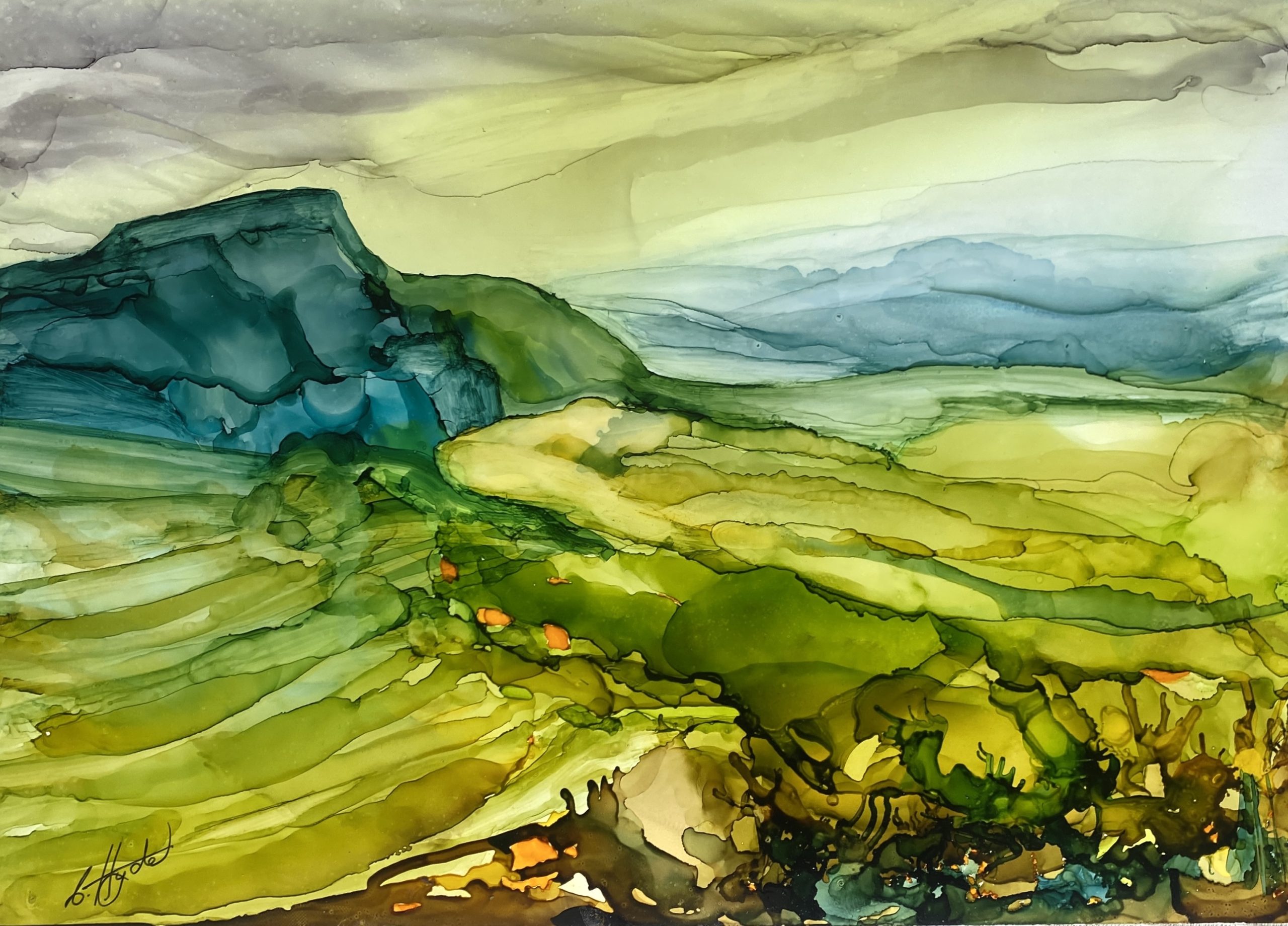 Valley Horizons by Christine Hyde is a strong expressive abstract landscape artwork of blended colours of teal blue and yellow with pops of apricot as it melds across the page. Enabled by the artist’s chosen medium of intense Pïnata inks this original artwork depicts the rolling countryside fields leading into blue mountains ranges..