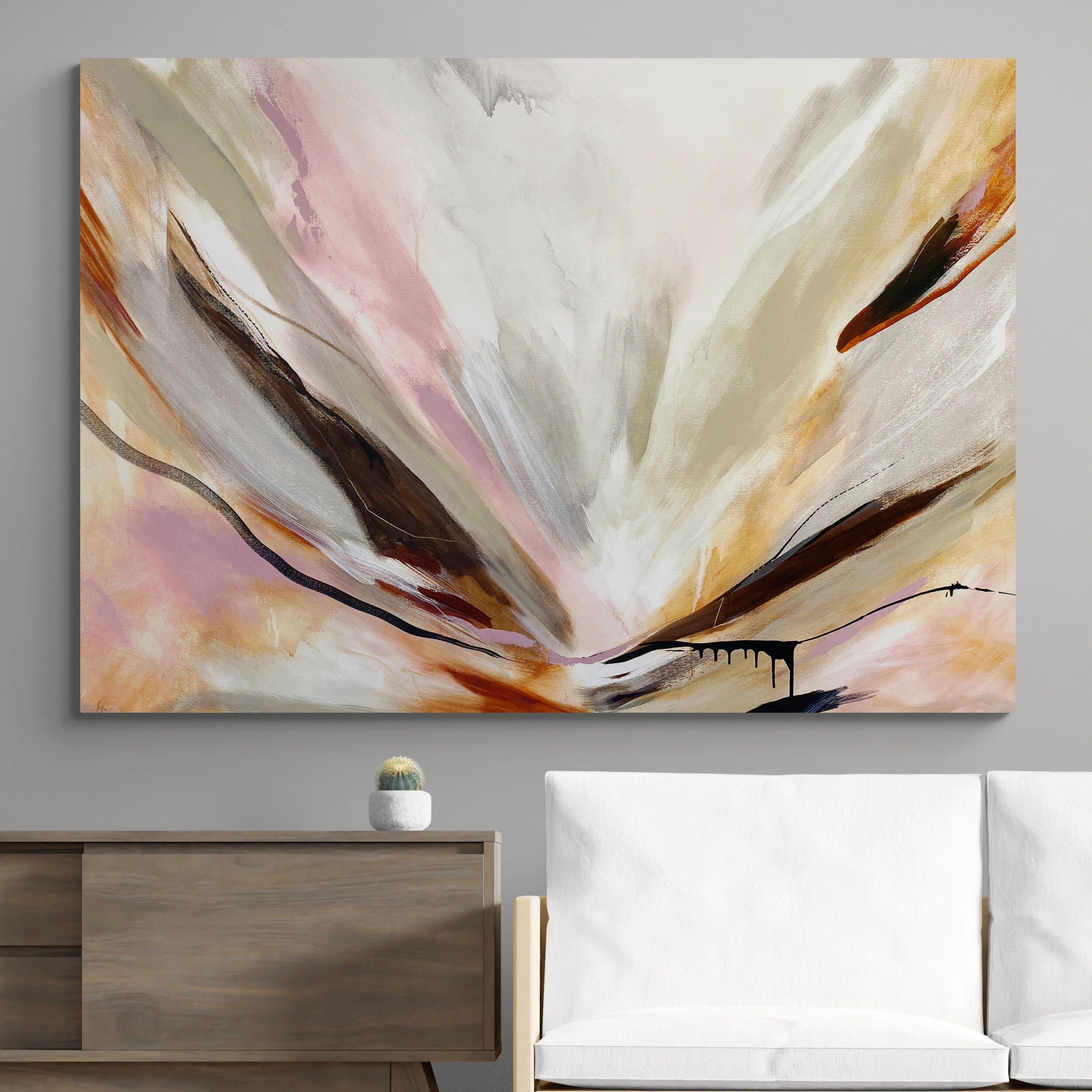 It’s intriguing mark making combined with its restful and calm palette of beautiful soft blush and subtle pinks, warm ochre and black, mixed with cool beige and white neutral tones makes this statement piece work so well in most spaces.