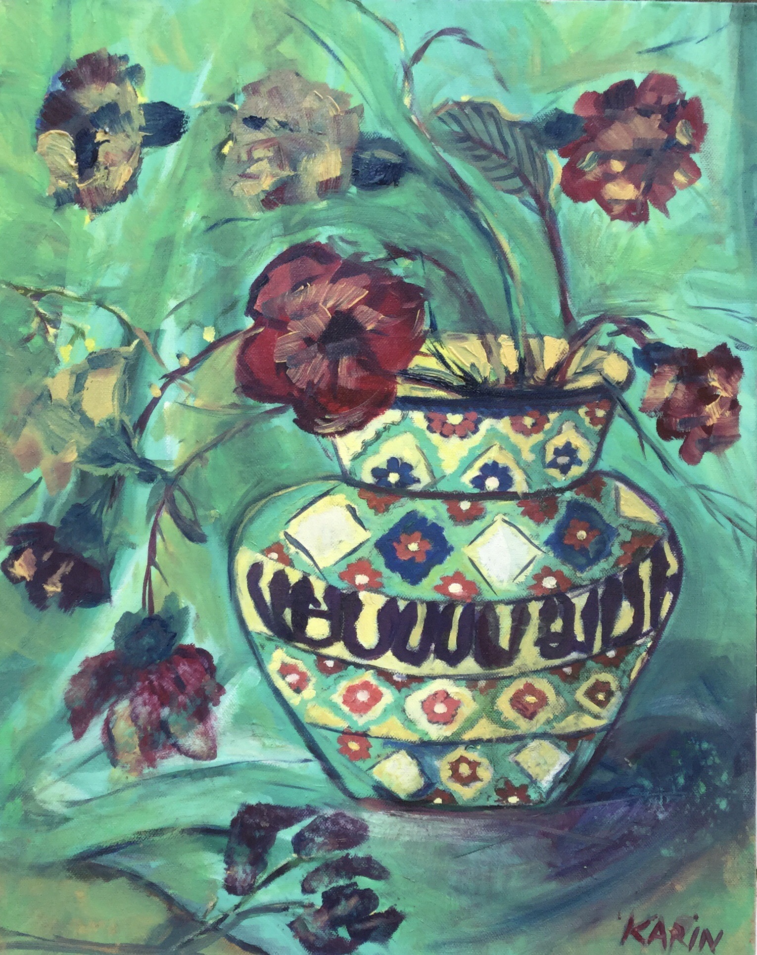 Vase of roses – Oriental patterned vase with roses in rich colours painted in oils with a combination of impressionism expressionism and a slightly abstract approach. A still life with an old world oriental charm.