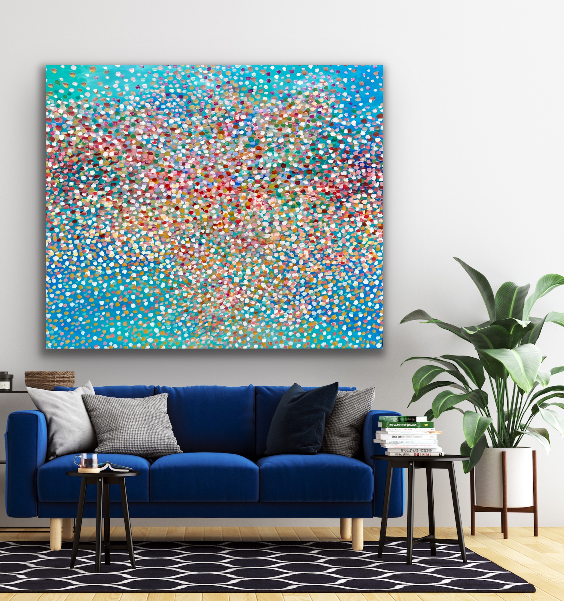 Beautiful white rose iceberg petals flying in the wind falling over a lake with light blues and pinks , orange, purples. Petals weeping from the sky onto the water creating this beautiful veil of colours covering the whole painting. A composition of colours and rhythms of petals dancing over the landscape like an explosion of fireworks . A very peaceful and tranquil painting with warm and cool colours with so much depth . This painting is painted on linen canvas and it does not come with an external frame.The painting is signed and dated 2021 at the back and comes with a certificate of Authenticity.