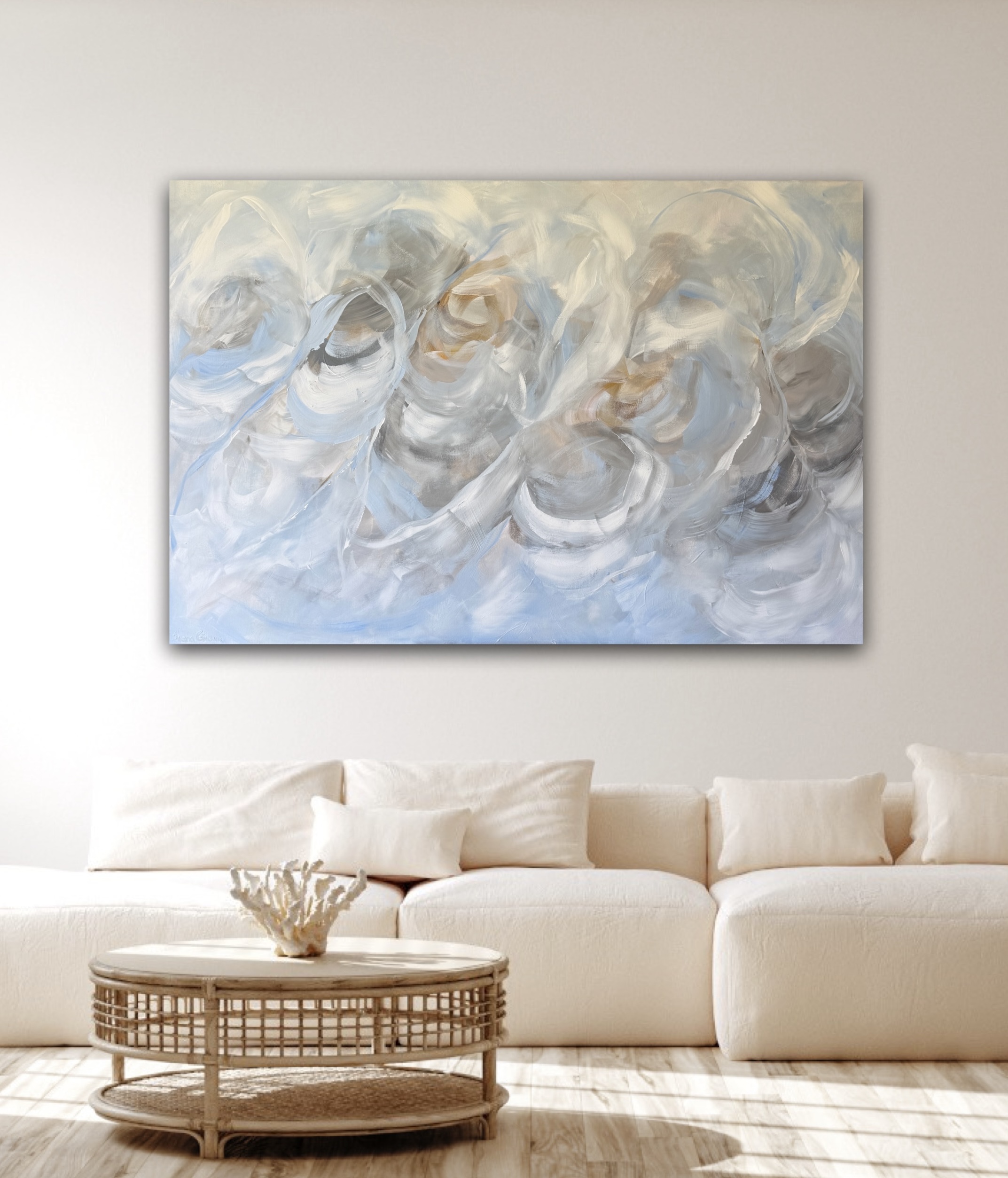 There’s something so peaceful about this piece, like the moment the sky shifts before sunset. The soft movement of creams, blues and gray’s feels light, almost like clouds gently drifting by. It’s calm and airy, yet full of quiet emotion, the kind of artwork that makes a space feel open, light and serene.