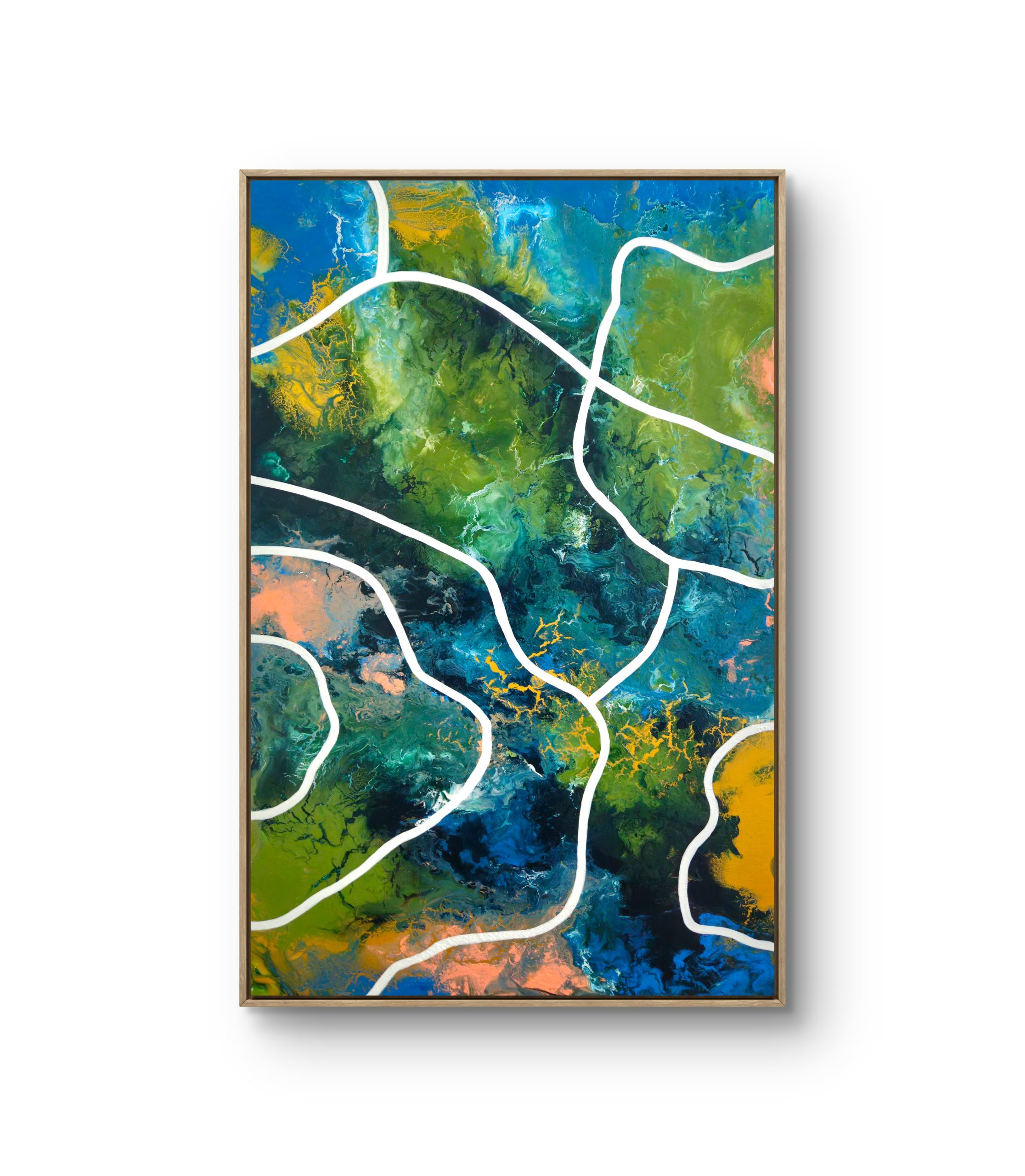 This piece is a visual journey through movement, emotion, and terrain — inspired by the raw, untamed beauty of nature seen from above. Bold colors swirl and collide, guided by flowing white lines that echo the paths we take in life — winding, uncertain, yet deeply connected.