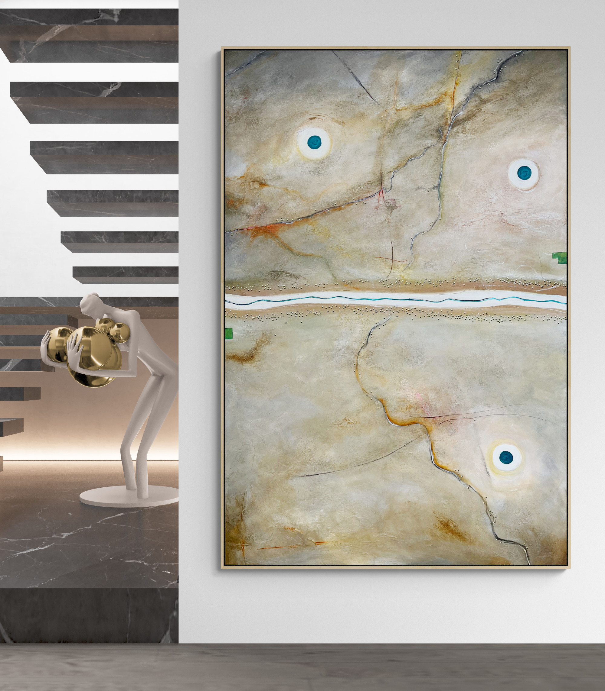 ‘Veins of The Land’ is a modern contemporary textured abstract painting, offering a bird’s-eye view of an earthy, neutral-toned landscape. With intricate details and flowing forms, it portrays the land’s natural waterways, weaving through the terrain like veins. The addition of three dams disrupts the flow, creating a contrast between nature’s organic paths and human intervention, blending raw textures and subtle tones to evoke a sense of connection and division within the landscape.