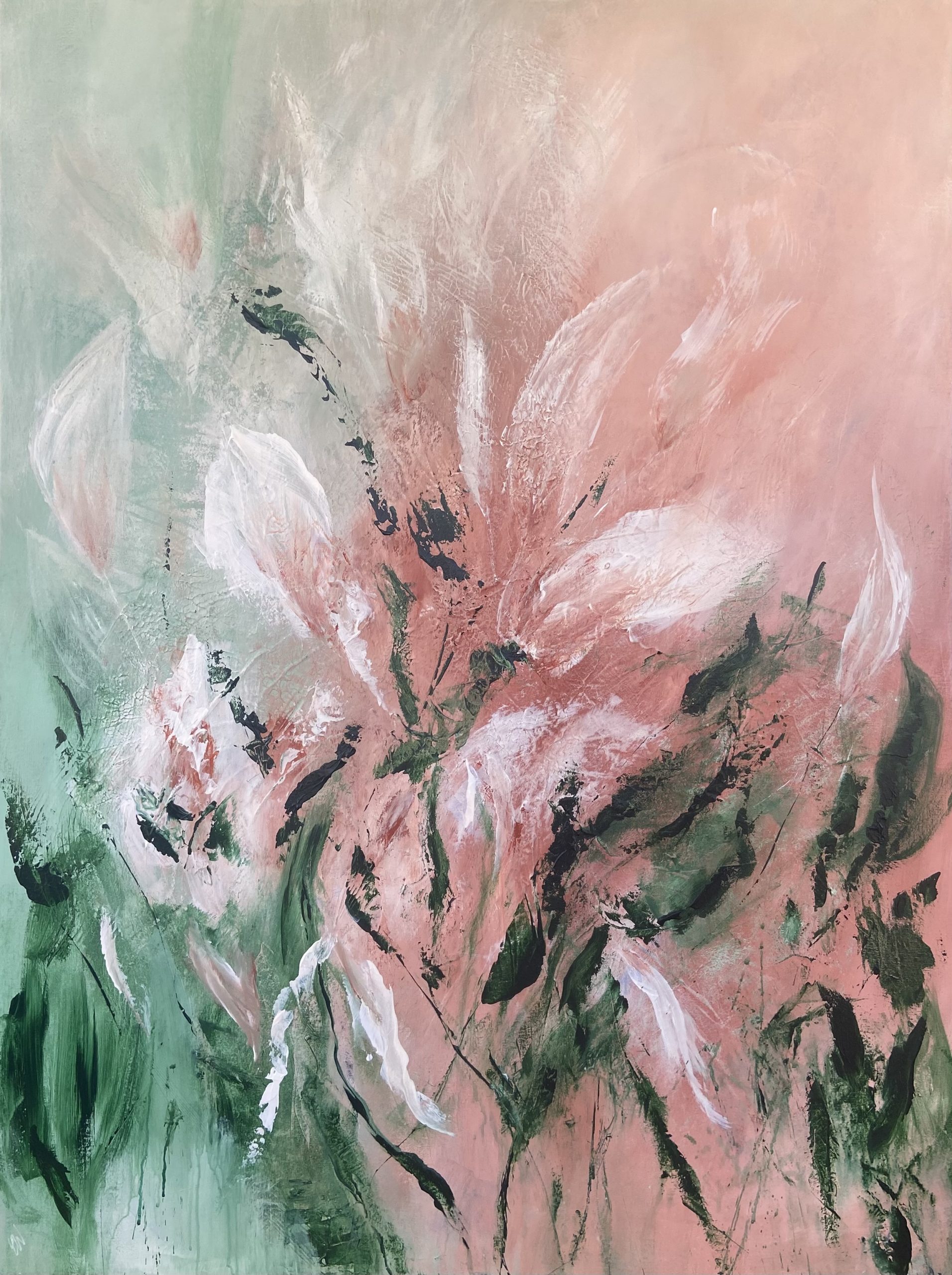 Velvet Petals by Carrie Welsh is a beautifully textured abstract botanical painting. 91.4 x 121.9 cm. Acrylic on canvas, ready to hang. Frame not included.