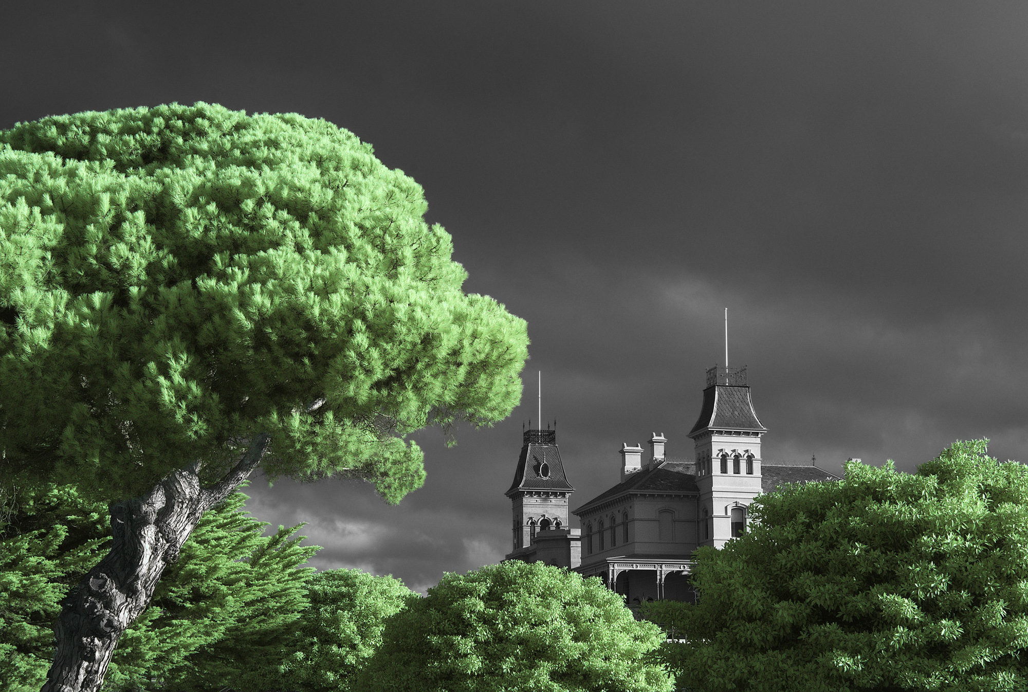 Under a heavy sky, this stately mansion makes a wonderful focal point, nestled amongst the lush, almost other-worldly green of surrounding trees.