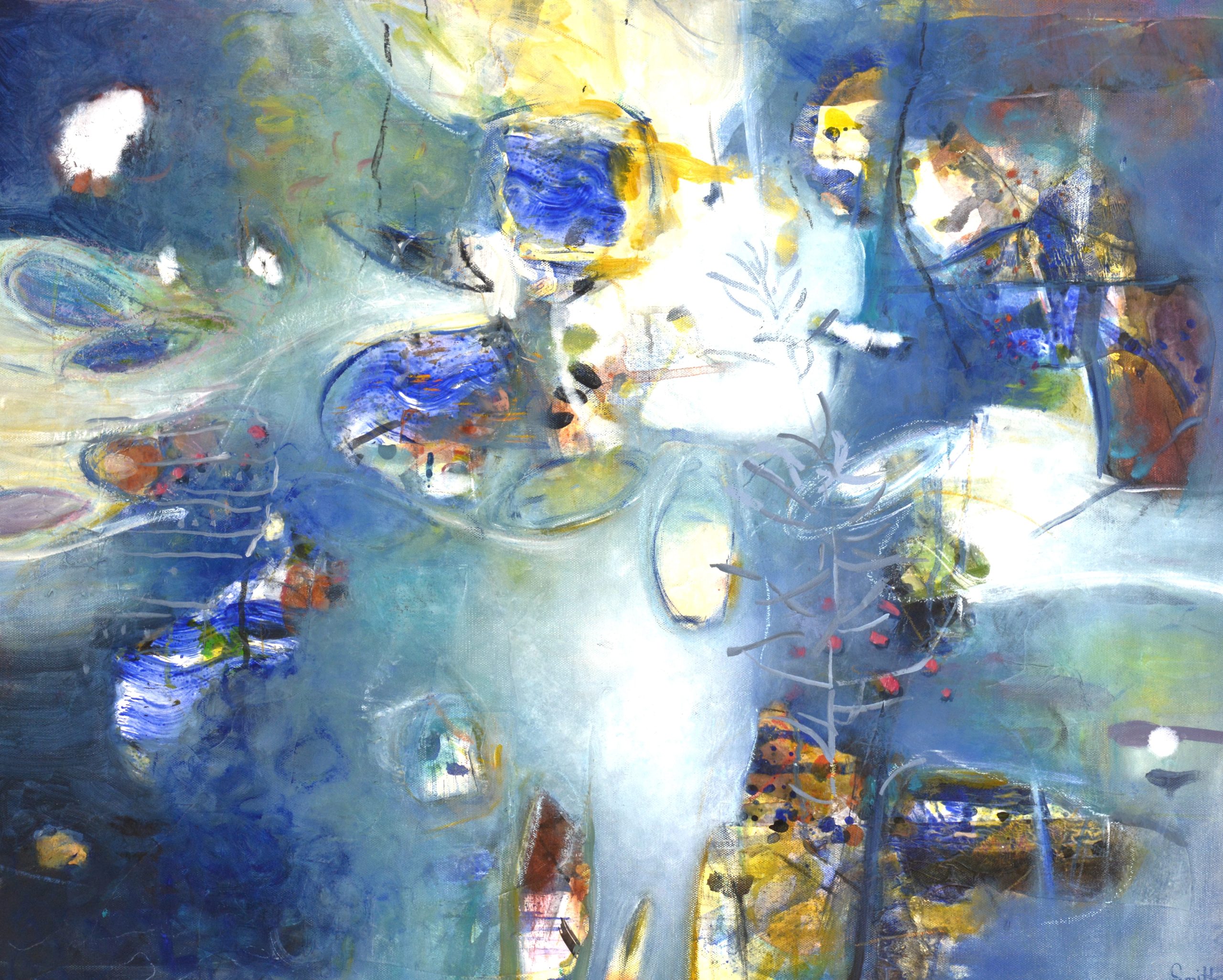 “Vibrant” by Dianne Smith is inspired by bright sunlight shifting and merging briefly on the surface of water creating unique patterns and shapes before dispersing.