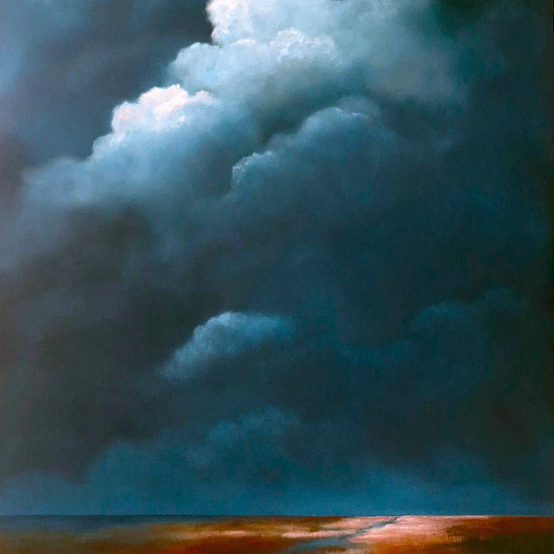 It is painted in portrait format and has deep 4 cm sides painted blue black. It is wired and ready to hang. It is signed both on the front and on the back of the canvas.