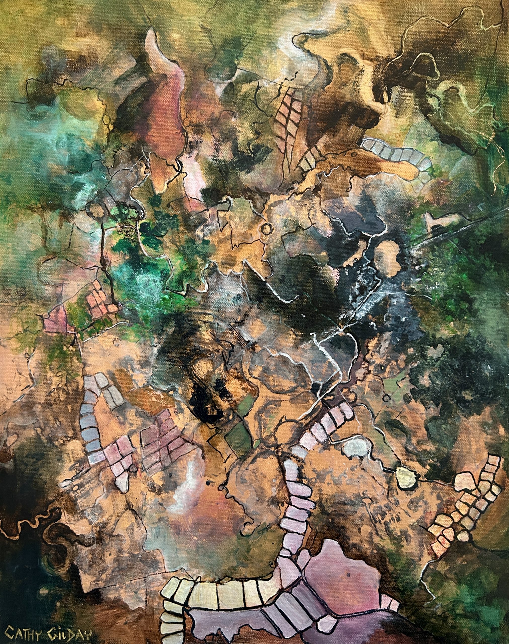 An aerial painting expressing the rich earthy colours, textures and patterns of the terrain below, captured from the perspective of a bird’s eye view.