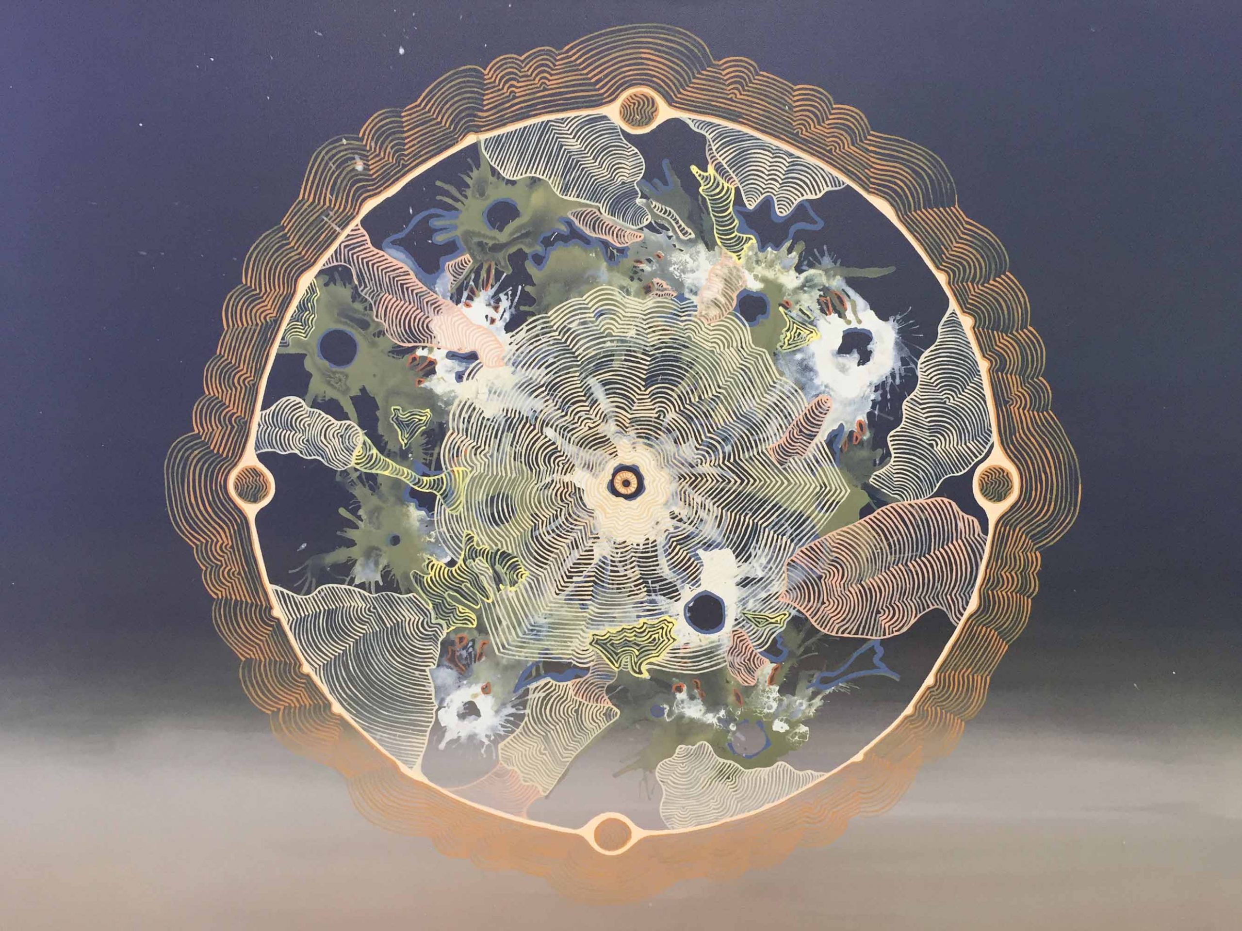 “Vigstamoin” is a creative response to a delightful Traditional folk tune originating from Norway. After numerous hours of listening to and dancing around my studio to “Vigstamoin” by the Danish String Quartet a beautiful, complex detailed layered circle was painted onto a green variant background. Conveying a sense of strength, solidarity, and being grounded.