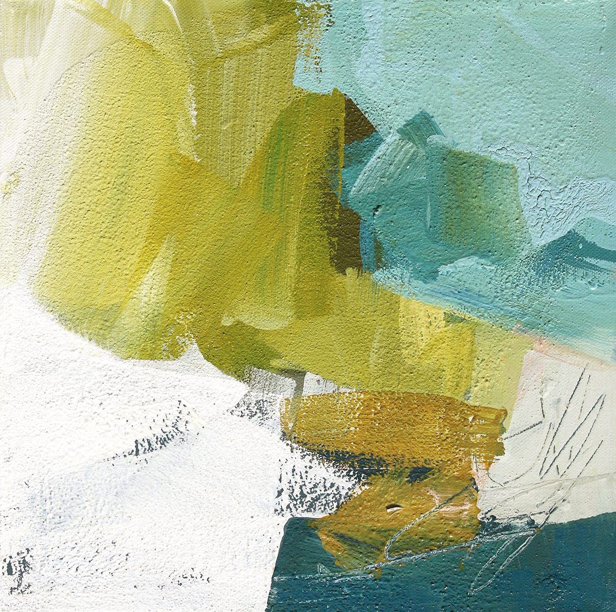 Vim is very textured and is a combination of sage, mustard and peacock with a touch of forest green and grey. The painting extends around the 3.8cm sides of the canvas. This size is perfect for small spaces, to sit on top of a sideboard or can be hung as part of a collection.