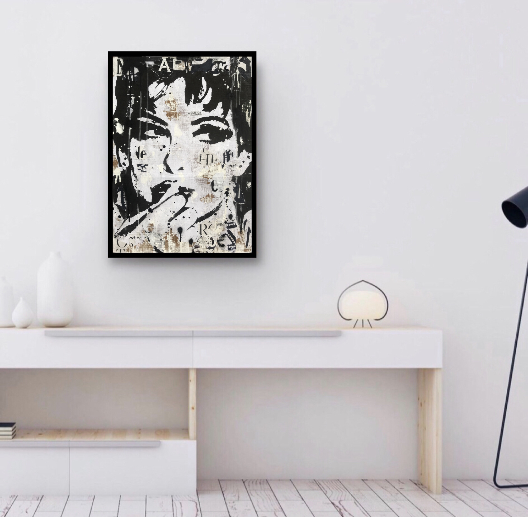 The main image is a Vintage Chanel Advertisement from the 80’s which was turned into a stencil then overlaid further with paint and paper to give a worn rustic street appearance.