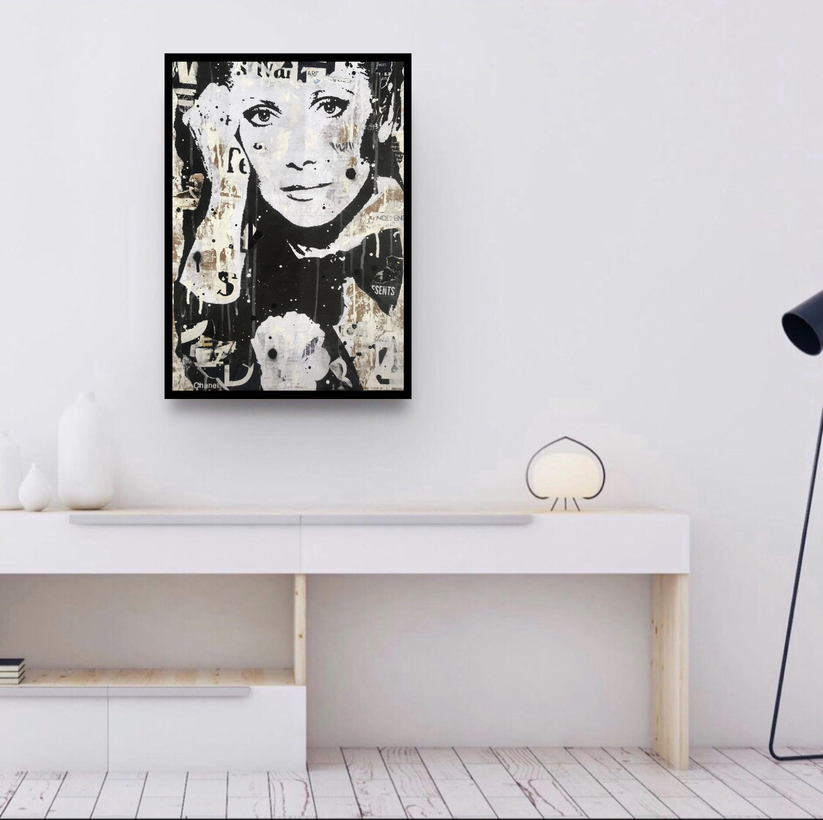 The main image is a Vintage Chanel Advertisement from the 70’s which was turned into a stencil then overlaid further with paint and paper to give a worn rustic street appearance.