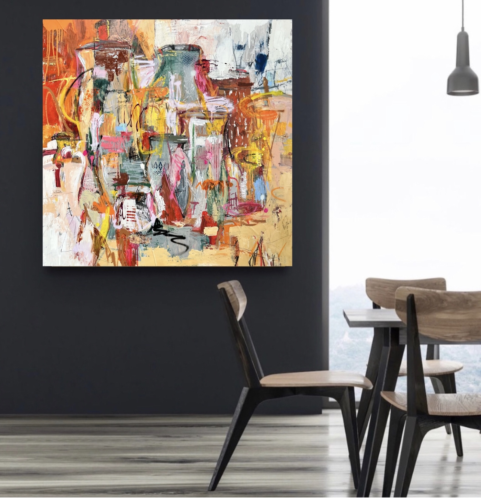 This abstract painting was directly influenced by my Vintage West German Pottery collection and stylistically takes inspiration from graffiti on street walls and weathered surfaces.