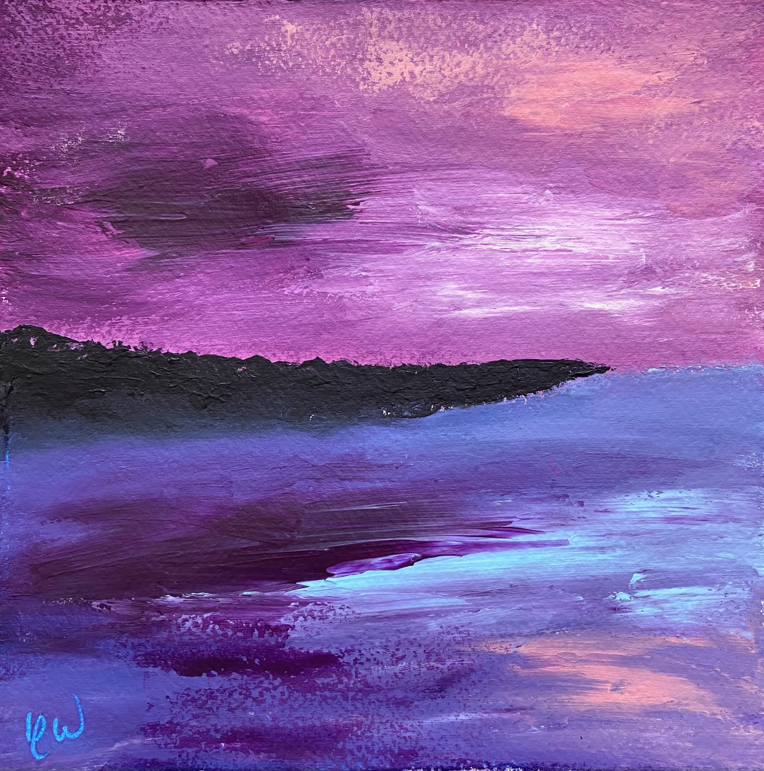 A beautiful abstract seascape set at sunset. Some images show what this piece looks like framed. Frames not included. 20 x 20 cm. Acrylic on paper. Requires framing.