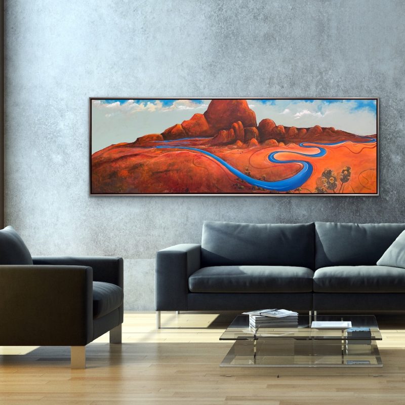 Inspired by the quiet shallows and reef edges of the Great Barrier Reef — the places where pale sandbars rest just beneath the surface and soft waves kiss the shoreline in slow, gentle rhythms. The colours move from seafoam and turquoise shallows into deeper ocean greens, with subtle golden reef textures glimmering beneath the surface. This is green wall art living room styling at its calmest — earthy, quiet, and deeply soothing.