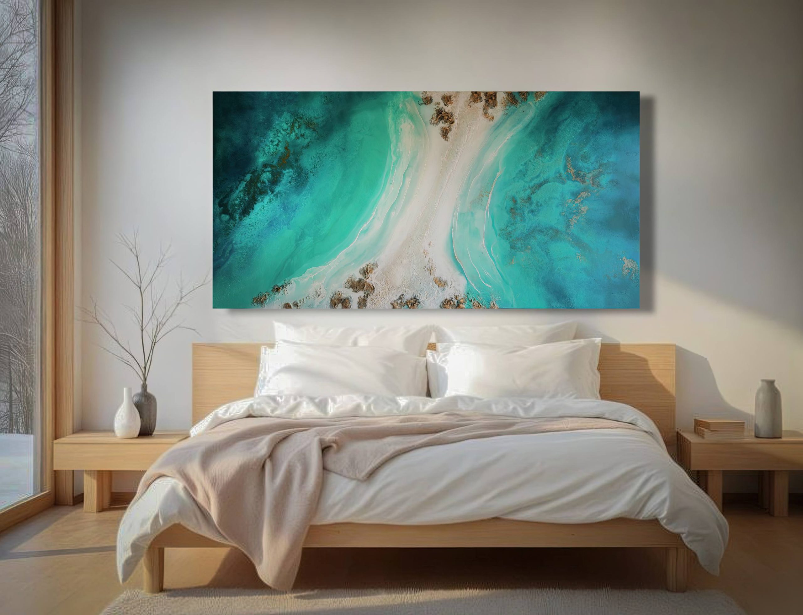Perfect as turquoise wall art large for above a sofa, over a bed, or in a serene living space, this piece brings a gentle coastal presence without overwhelming a room. It holds the feeling of a place that is untouched — a quiet lagoon, a sheltered reef flat, a moment of being the only person there.