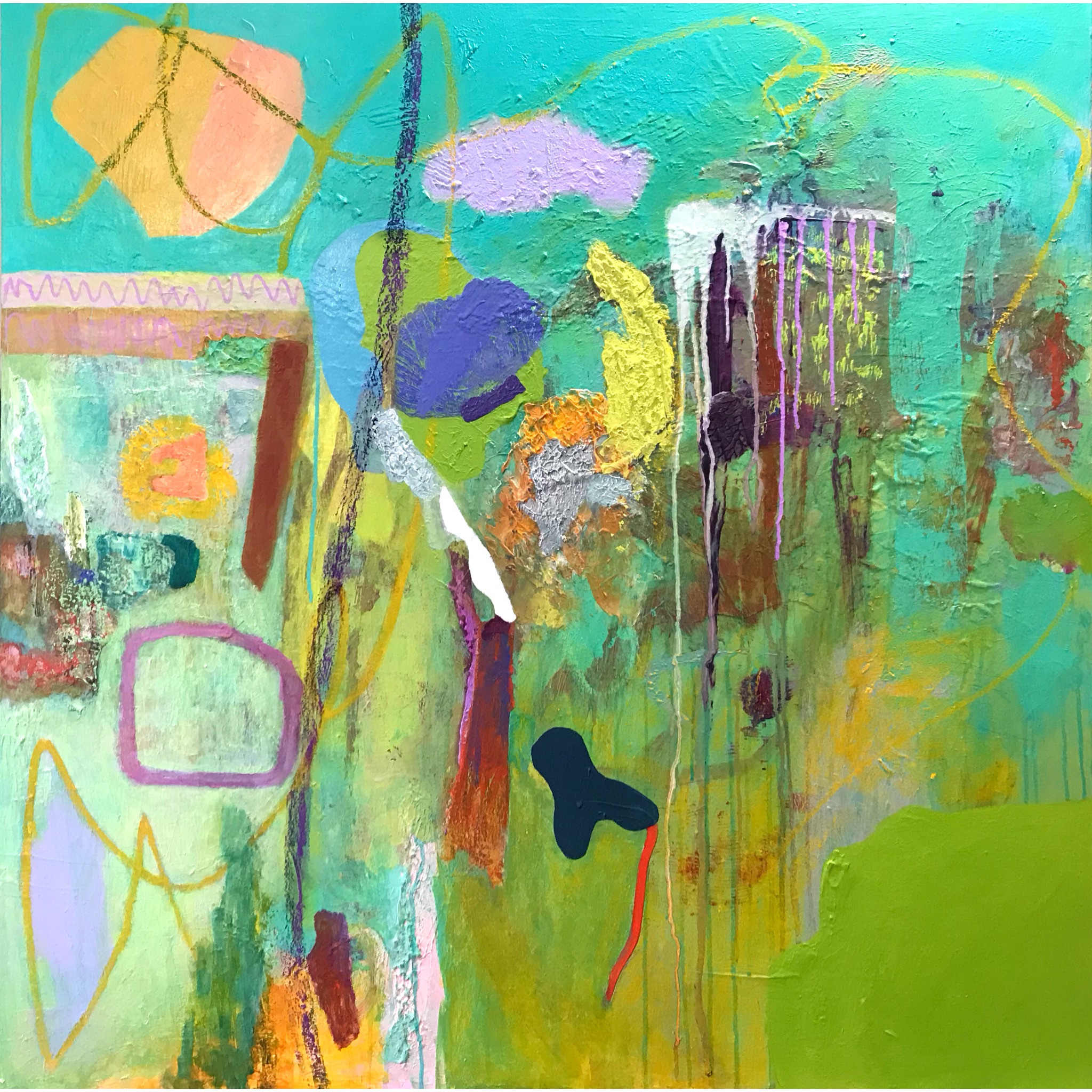 This is my colourful search for another dimension of possibilities, through abstraction, to experience the joy of colour. My journey to explore how shapes and colours make me feel continues in this piece where I push thoughtful energy and intuitive design into the picture plane.