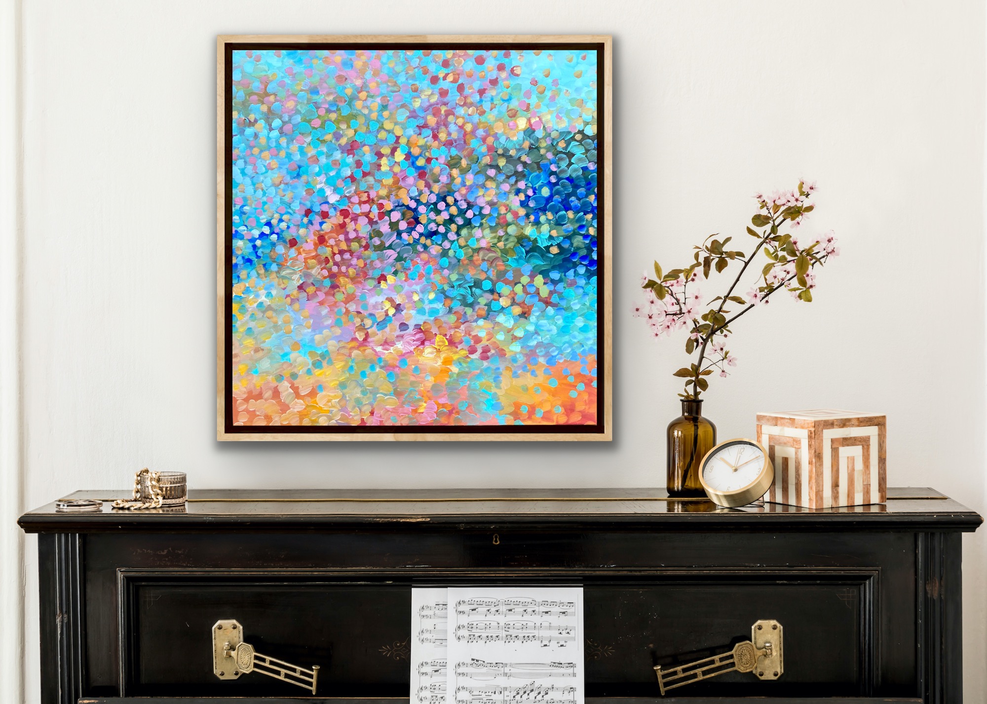 Vision of Beauty by Theo Papathomas is a painting with a pallet of rich colours like a veil of petals covering the hills. The landscape becomes a bouquet of petals dancing over the land. I tried to create this beautiful composition of colours of the landscape and softly becoming one with the sky, waterfalls and hills. Capturing the beautiful colours of the petals, foliage of the trees like musical notes dancing over the landscape. A very harmonious and tranquil composition that can be enjoyed many years to come. This is my first painting completed in 2021and comes with an external frame. The painting is signed and dated 2021 at the back and comes with a certificate of Authenticity.
