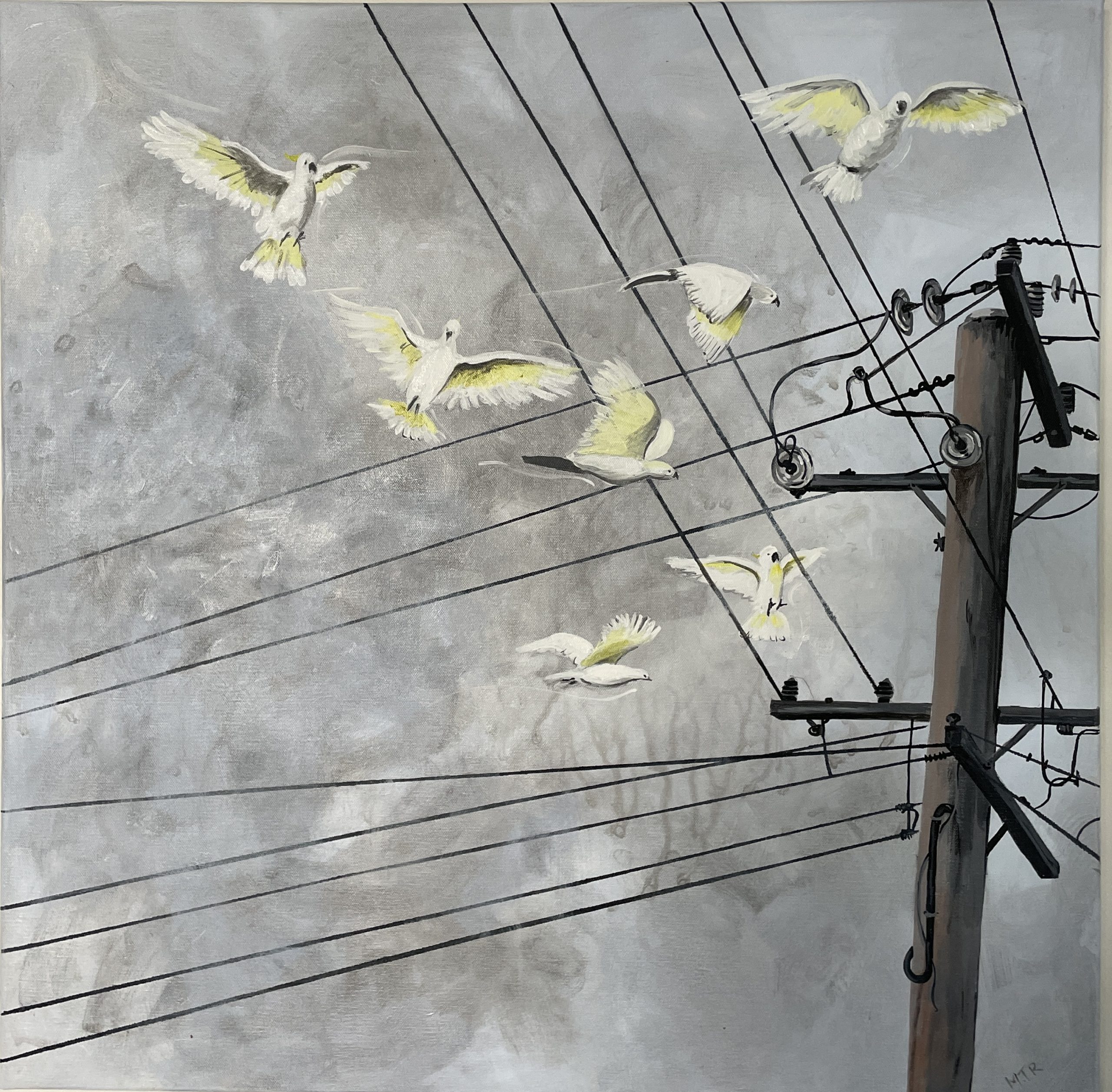 Visiting Cockatoos by Marie Riordan – This work is a salute to all the cockatoos that visit us on a daily basis. They are noisy, loud, screeching birds but I love them!