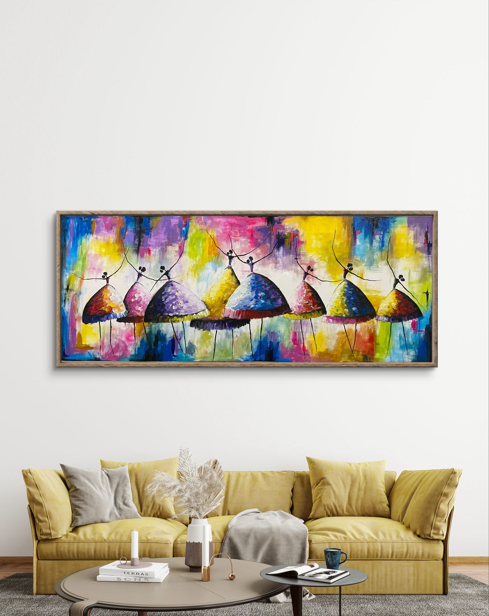 Step into a world of movement and color with this abstract ballerina painting. Brightly adorned dancers twirl across the canvas, their flowing frocks bursting with a spectrum of radiant hues. The vibrant background complements their energy, creating a mesmerizing dance of light and color. This artwork captures the beauty of motion, celebrating the grace and elegance of ballet with an abstract twist.