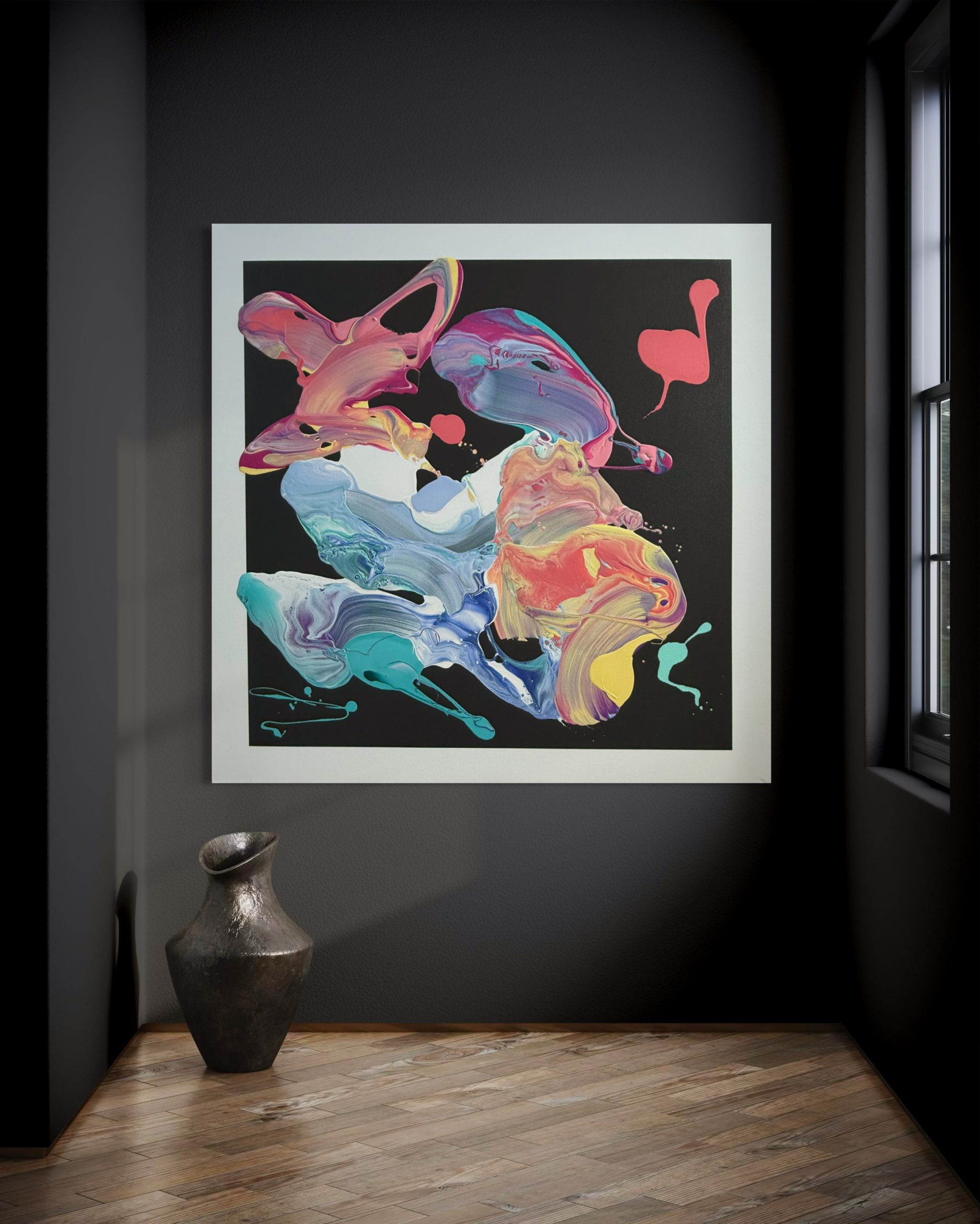 Vivid motion pt 2 by Jonathan Redmayne. A vibrant explosion of colours and fluid lines, capturing the essence of harmonious movement on a dark background.
