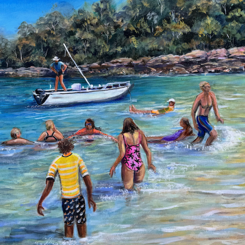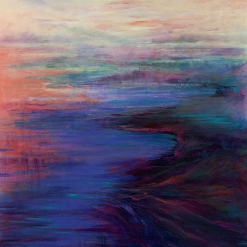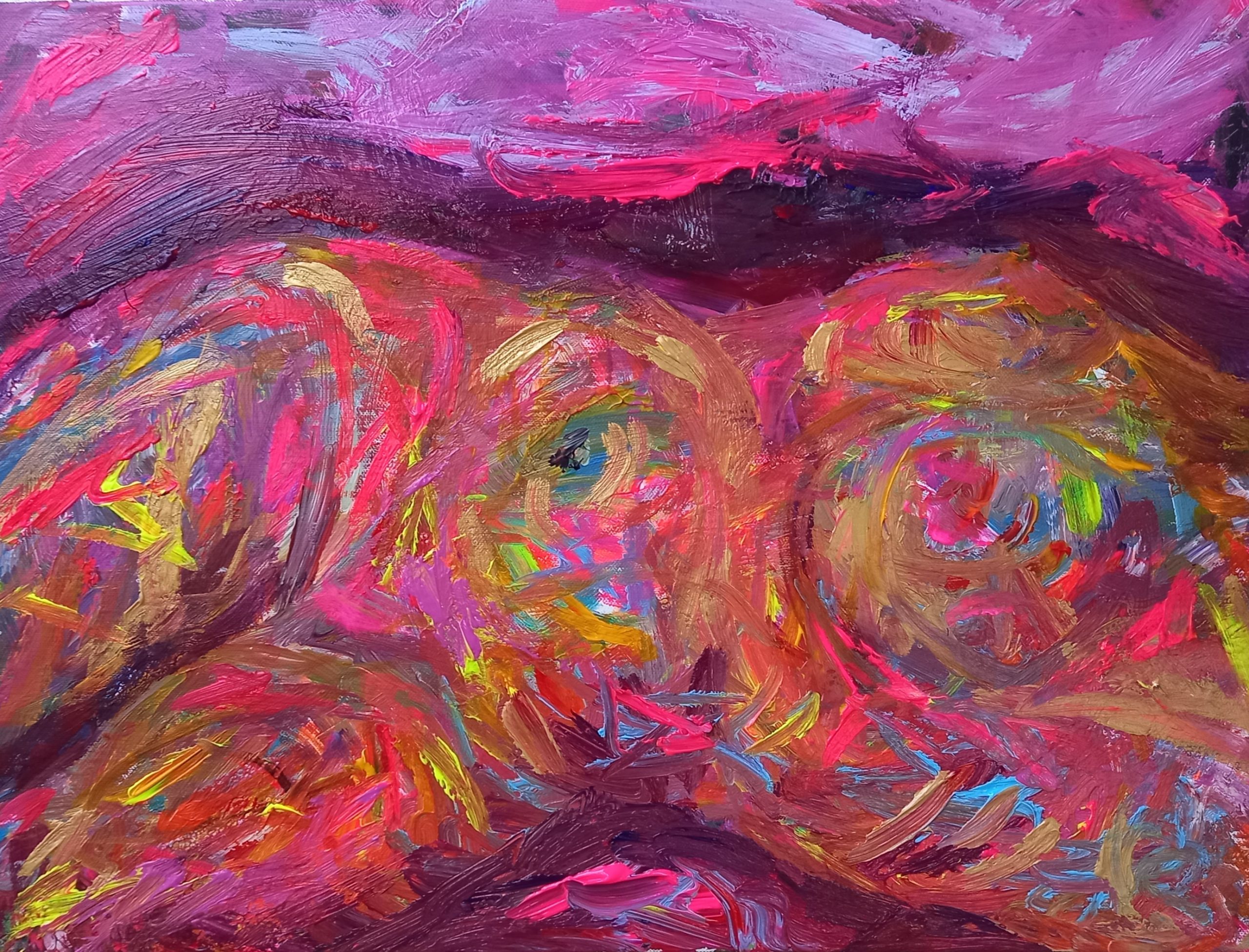 Romantic pinks, mauves and gold flicks, an almost landscape like female body lying under a pink mauve sky. Vibrant, exciting, expressive, textural and beautiful contemplative painting.