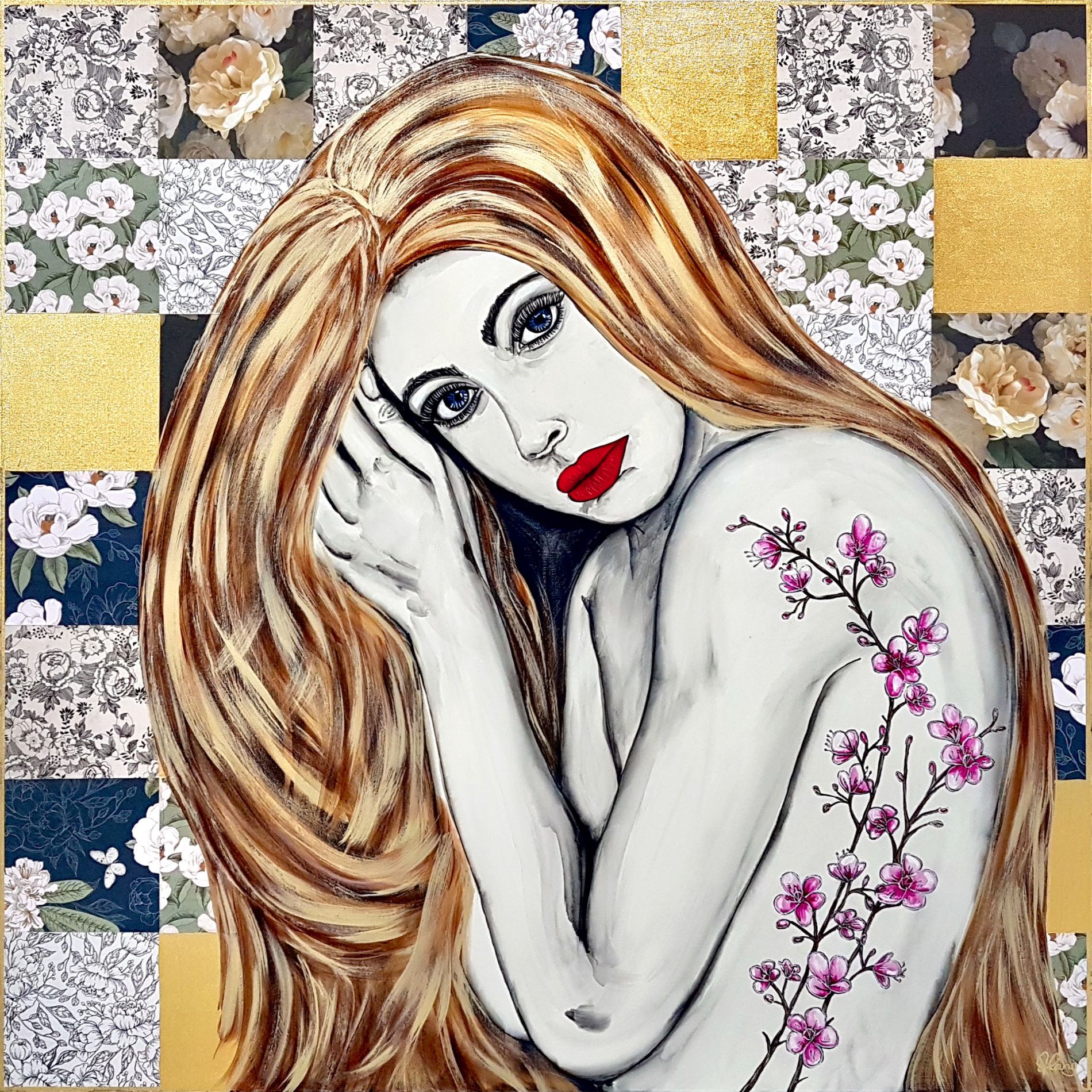 Acrylic paint and ink, gold leaf on patterned floral paper on stretched canvas