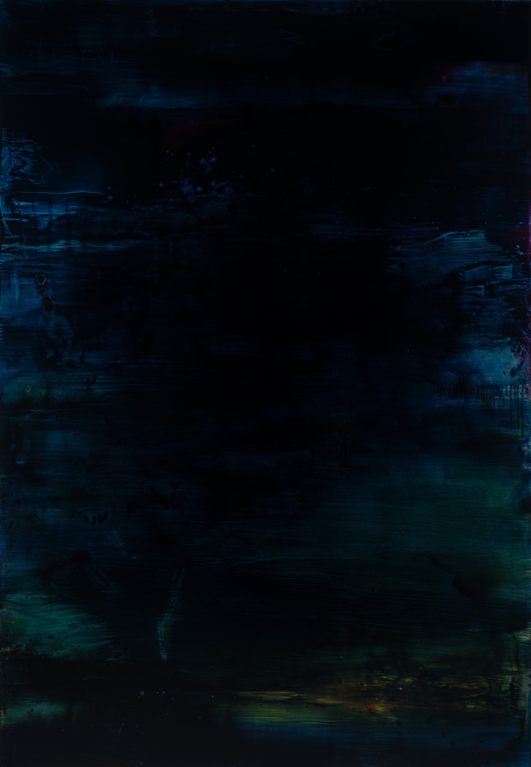 Working with water, acrylic paint, and various mediums on aluminium composite panel (ACP), Kypriadakis engages in a meditative dialogue with materials to create paintings that evoke stillness and invite slow looking. Her process involves an intuitive response to a body of water, embodying site-specific colours and light, bold first layers made with unconventional tools, followed by a meticulous, quietening process of multiple glazes and sanding back, to arrive at a luminous surface that appears as faintly recognizable yet unknowable.