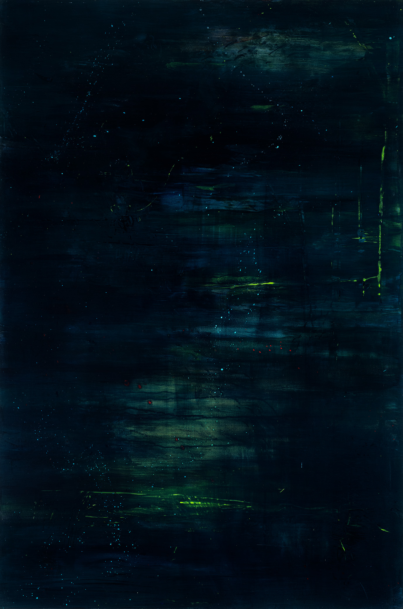 Working with water, acrylic paint, and various mediums on aluminium composite panel (ACP), Kypriadakis engages in a meditative dialogue with materials to create paintings that evoke stillness and invite slow looking. Her process involves an intuitive response to a body of water, embodying site-specific colours and light, bold first layers made with unconventional tools, followed by a meticulous, quietening process of multiple glazes and sanding back, to arrive at a luminous surface that appears as faintly recognizable yet unknowable.