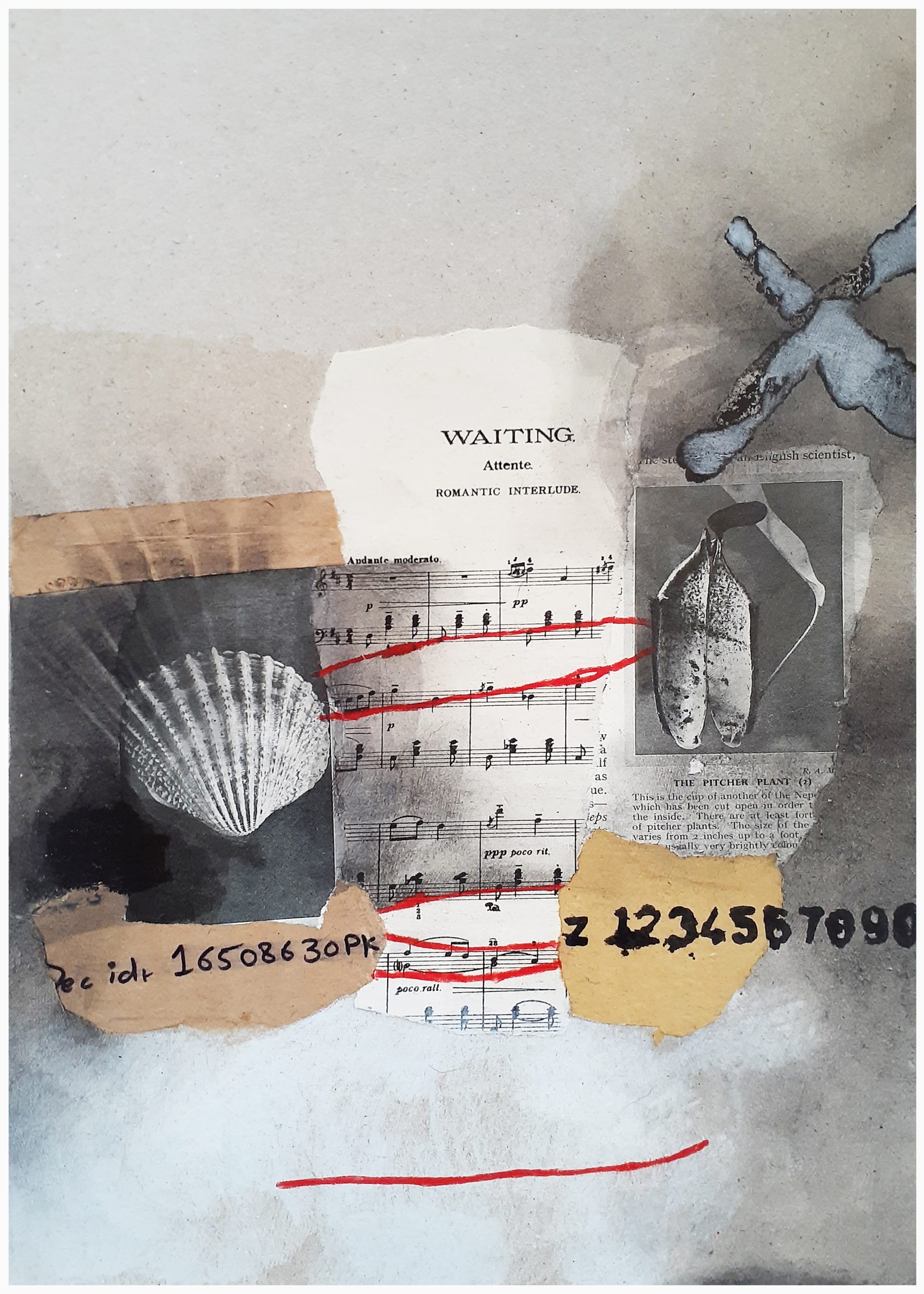 ” Waiting ” is a mixed media artwork by Melbourne abstract artist G Kustom Kuhl that uses found objects such as vintage pictorial images to combine with his abstract techniques with the use of pencils, inks, paint, papers and hand made forms [for printing] to explore human emotions, conscious and sub-conscious thoughts.. Enjoying the beauty in the everyday for a brighter tomorrow.