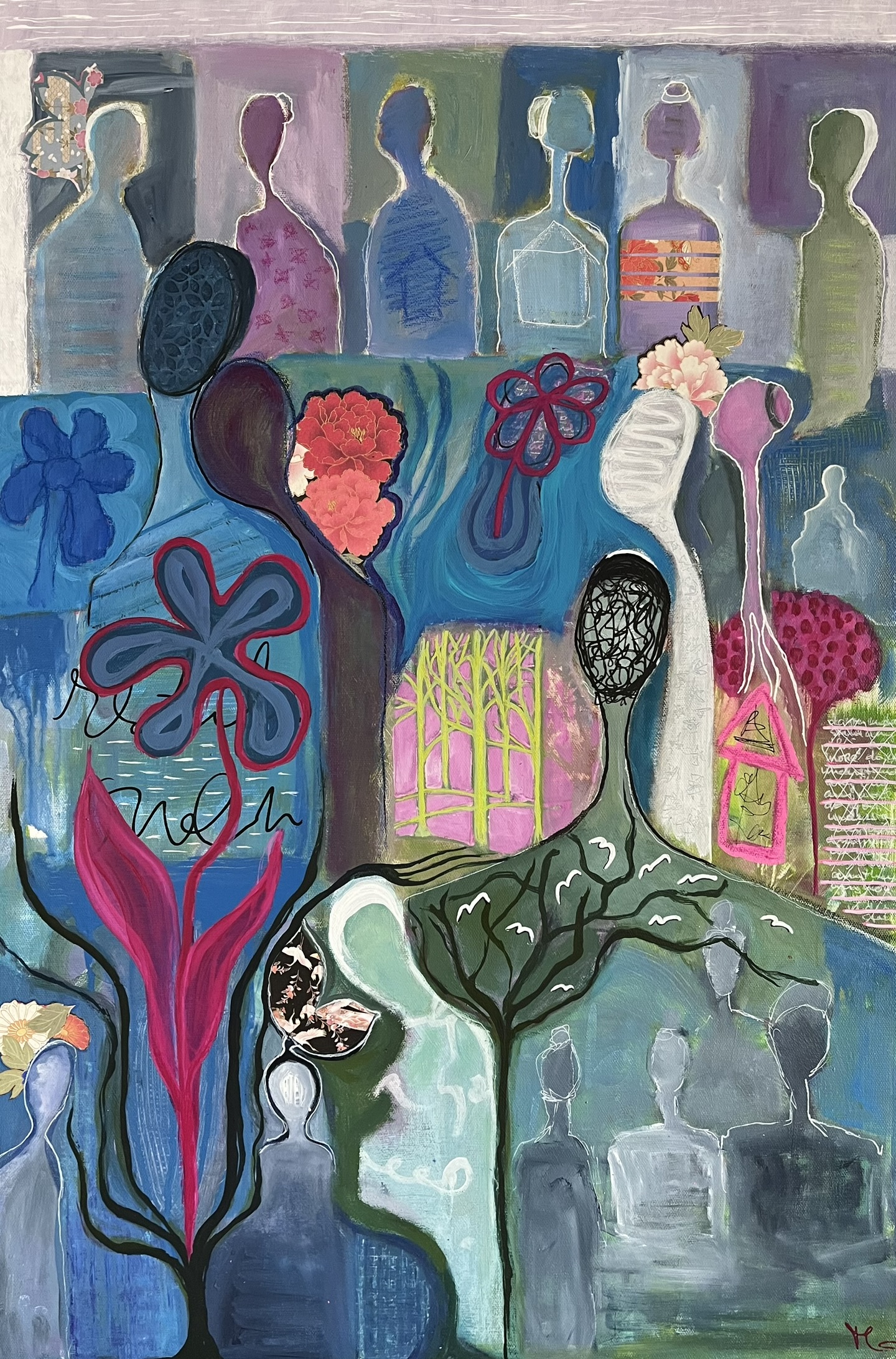 This work is a follow-up from the first painting of the same theme (sold) as it’s still and even more so at this moment about contemplating the future we thought we had and still have, the dreams we had and still have. The figures in the painting may represent the collective family of species on the planet