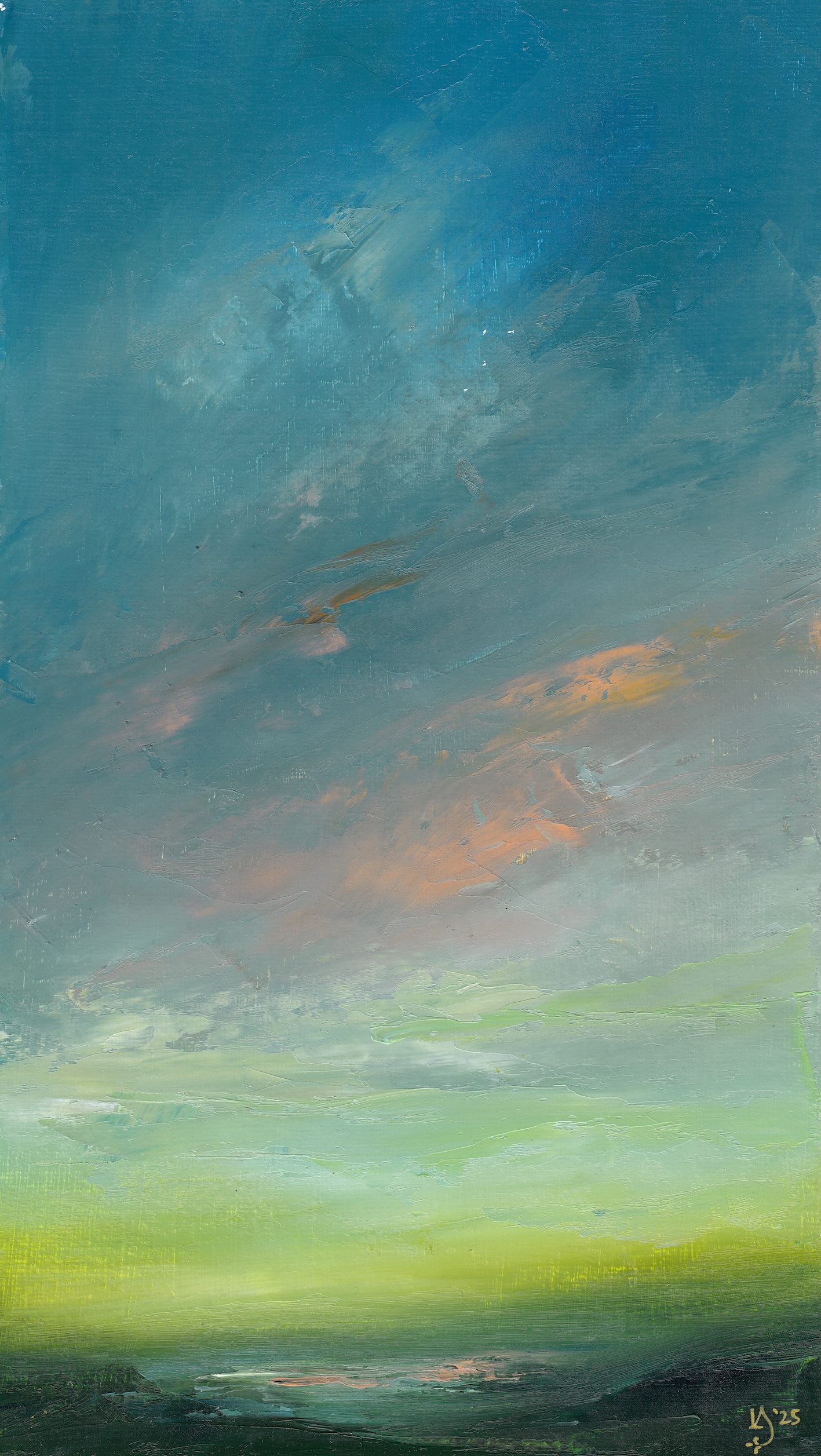 This was painted mainly with a palette knife, allowing for texture and movement in the sky, juxtaposing with smoother foreground.