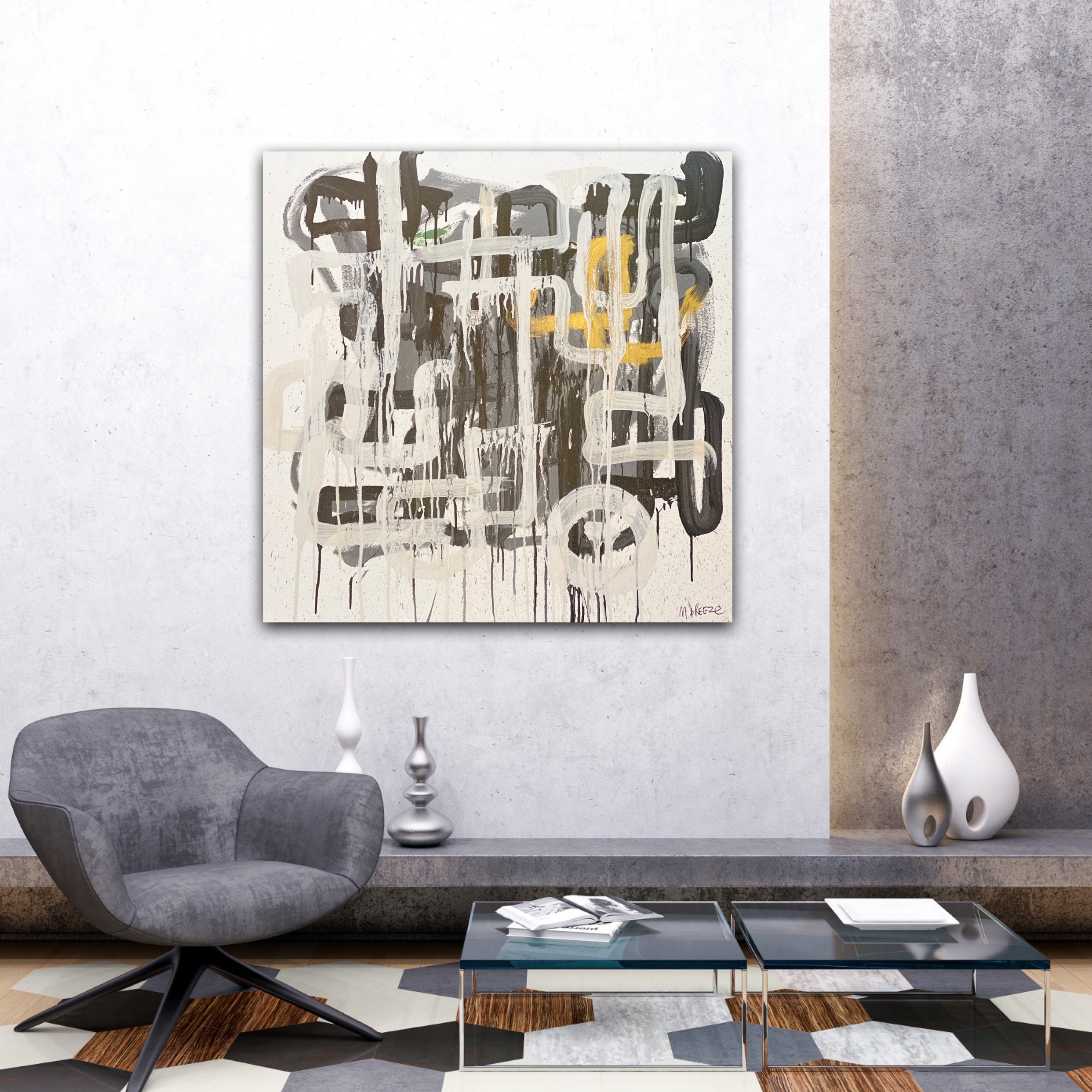 Waiting for the Rains by Martin Breeze adopts a simplistic palette which expands into a mind map of shape and texture. Layers intertwine, creating highlights and depth to give this piece a sense of journey and movement. This is a unique, original Artwork (2021) and is part of the artists abstract series.