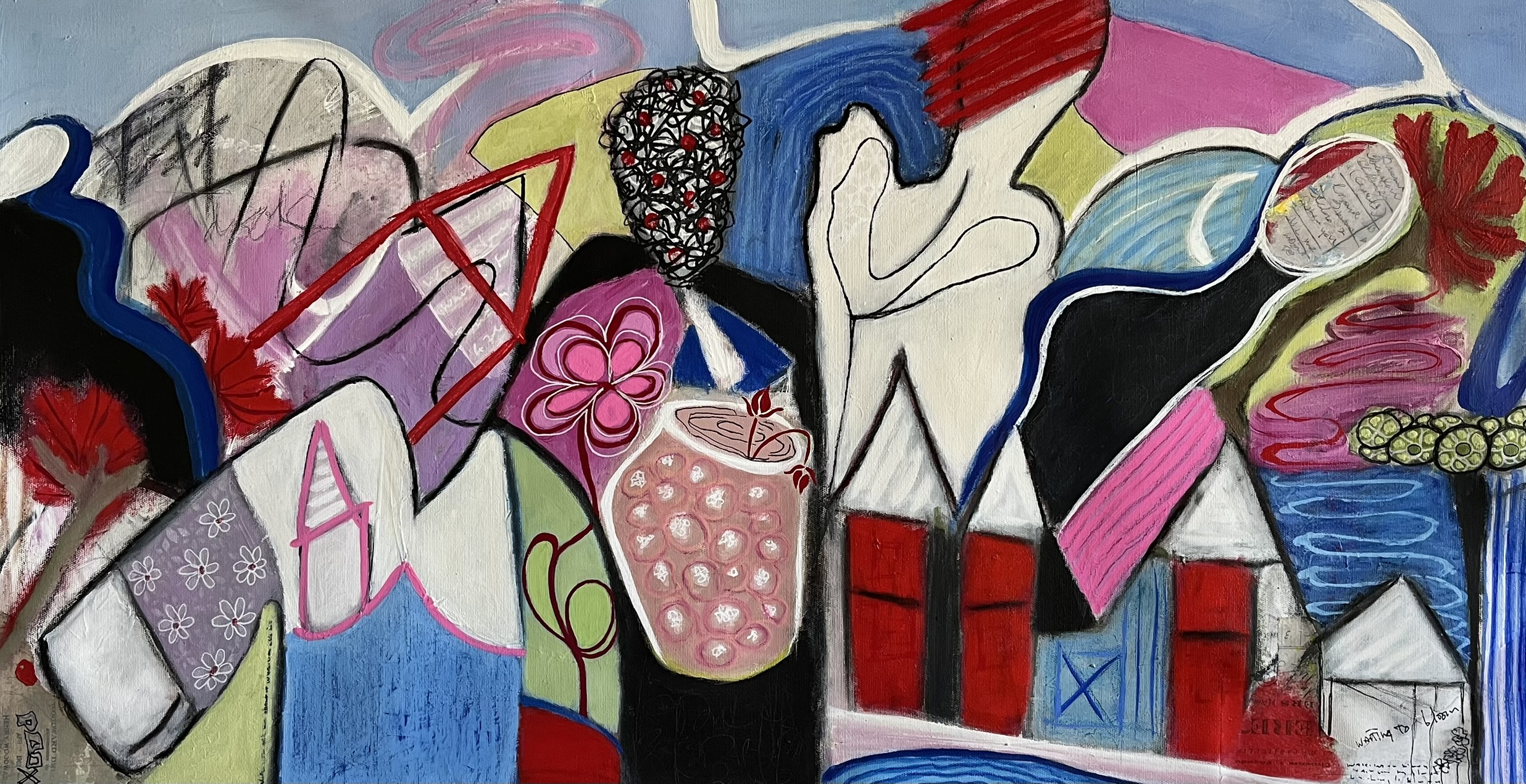 The colorful contrasting colors of the seed pods and flower-like forms, the shelter/houses, flowing waters all carry a sense of hope of renewing, love and healing in times of change, instability or displacement. A human need waiting for safety, peace and the right conditions to bloom