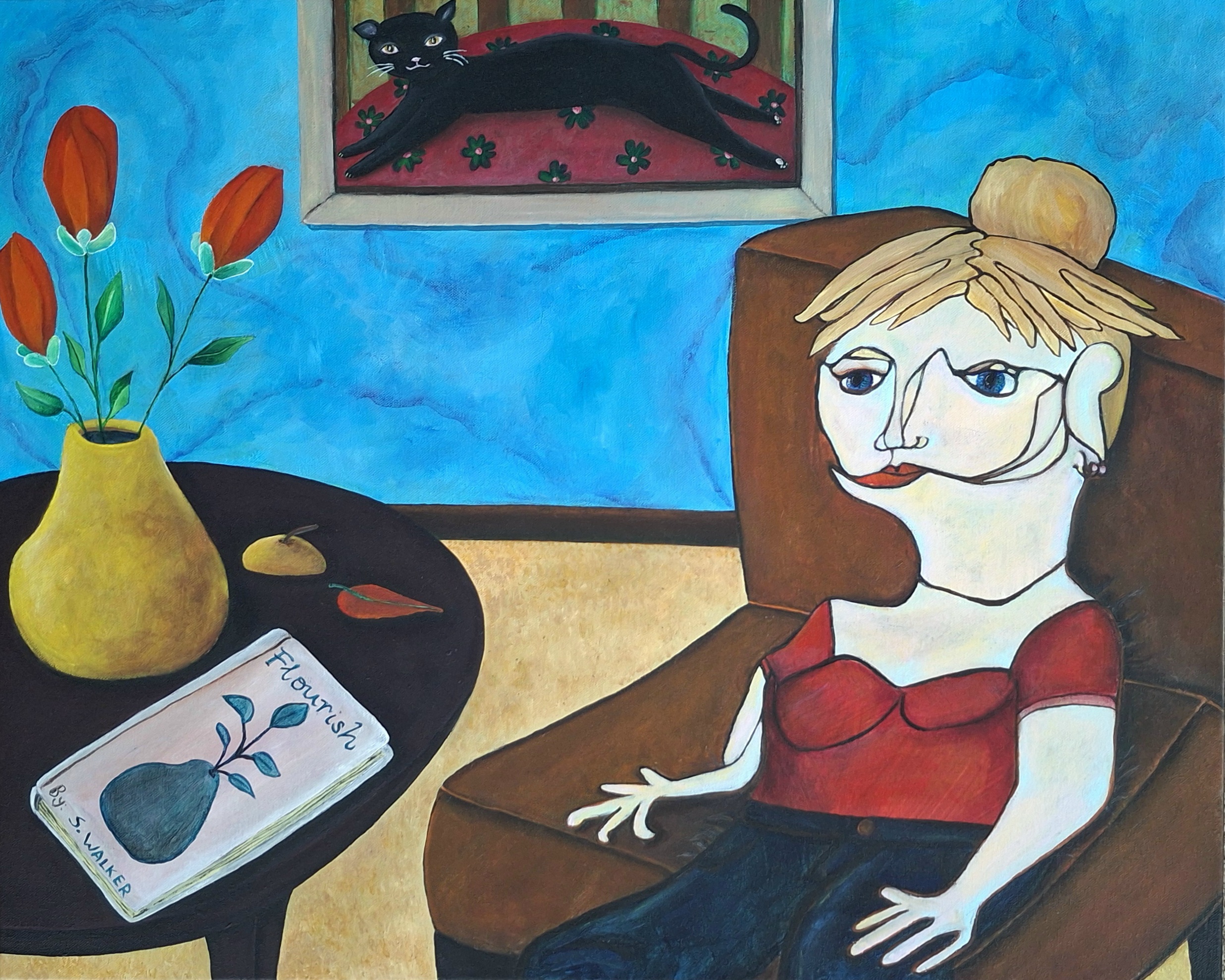 The figure is resigned to the wait but not pessimistic. The set of the jaw, the slouched posture capture the tension of the wait, but the eyes are bright and colours vibrant to symbolise the hope for this season to pass. The flowers are in bud but yet to open, and the kitten watches on with detached amusement at the silly human because what are these things to a cat.