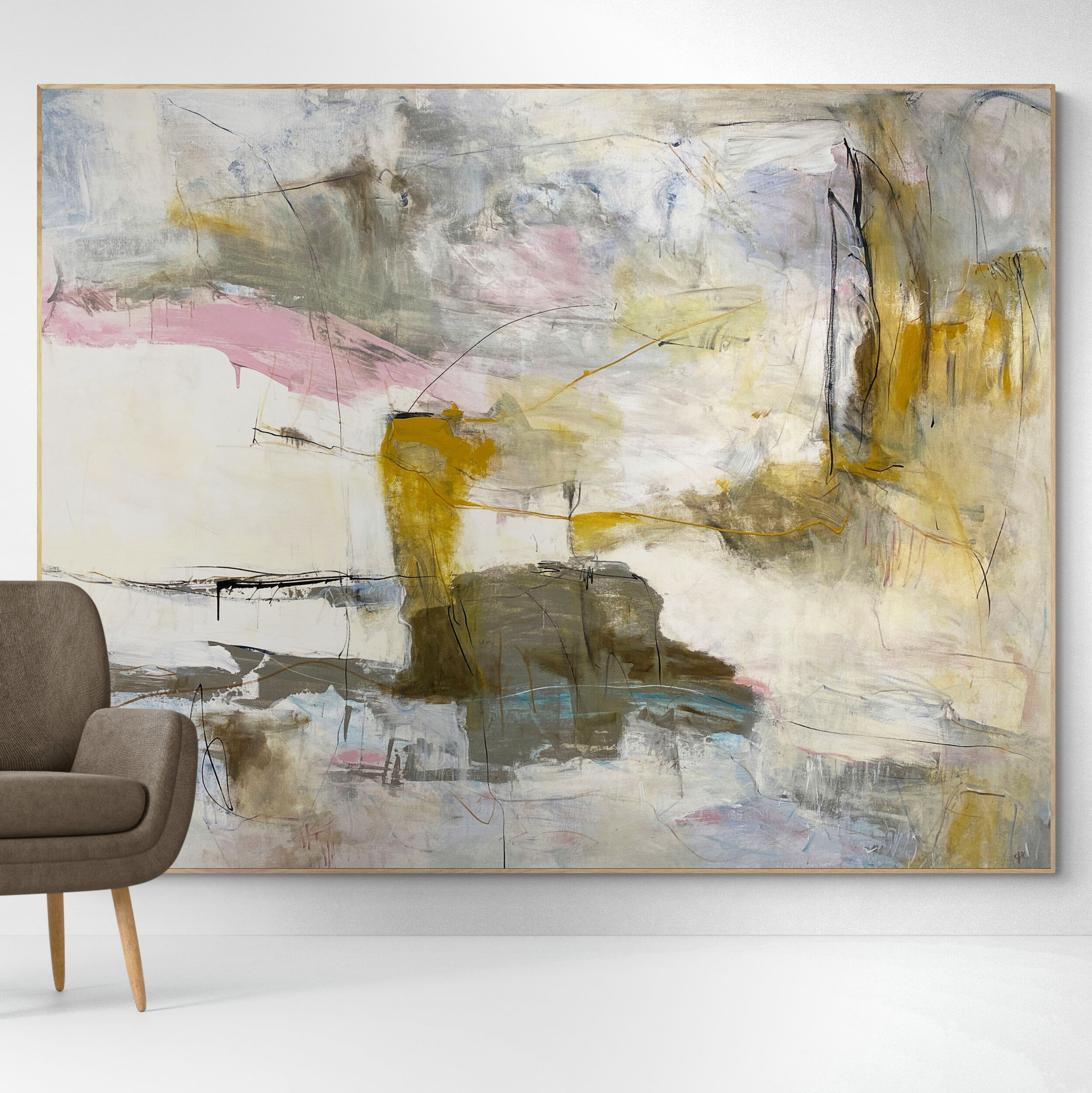 Waking Up The Sun is a beautiful oversized statement painting perfect for any large space. It has some texture in places and a subtle palette of blush pink, light teal, beige, brown, grey, black, warm ochre and white with glimpses of green and blue against bold rhythmic marks in paint and pencil across the canvas surface.