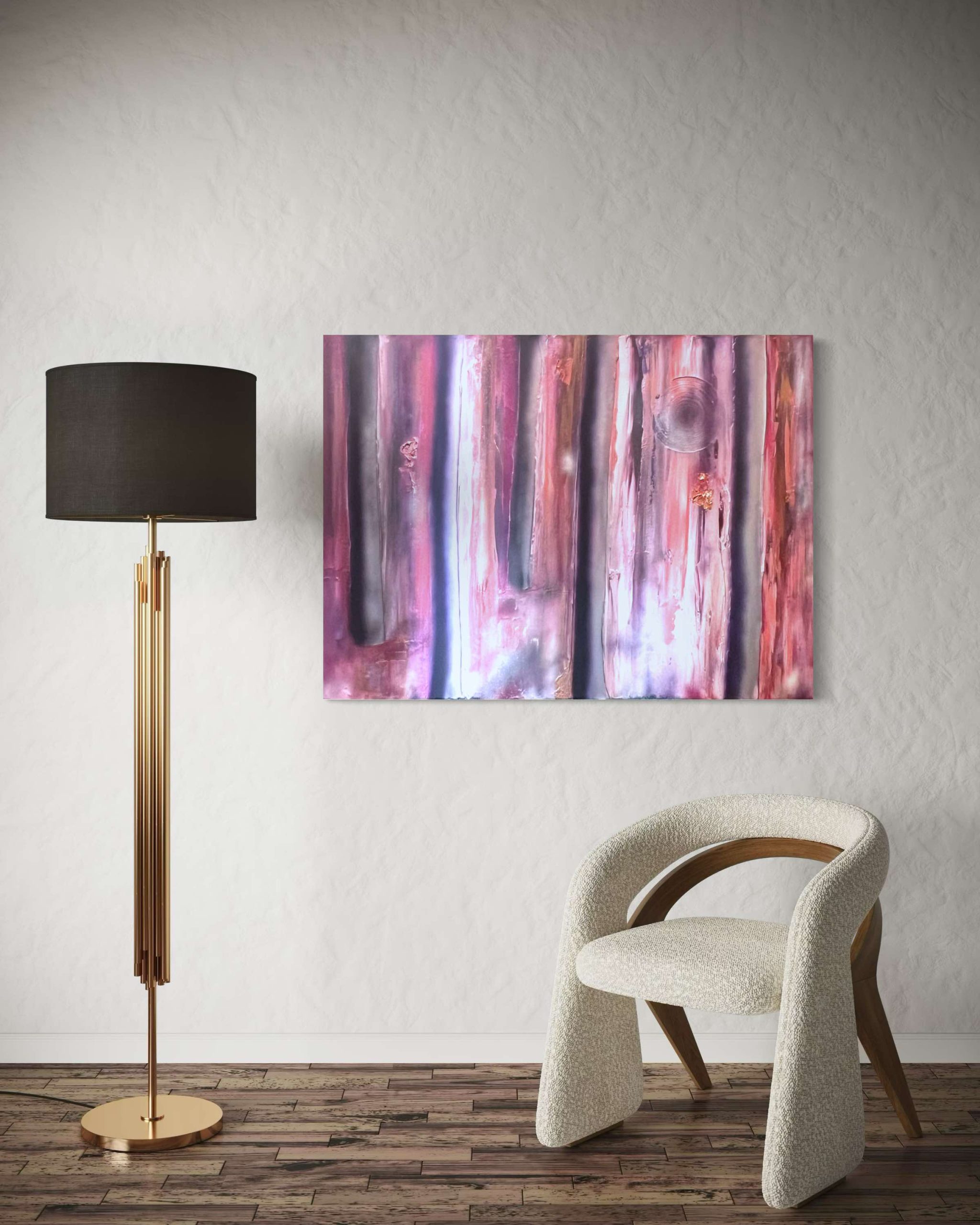 This magenta beauty contains highlights of metallics- including copper leaf and gold spray. The painting explores textures and contrast of light in the evening while walking the forest. Its ethereal qualities take you to another place and would be a beautiful and calming piece for any home or office.