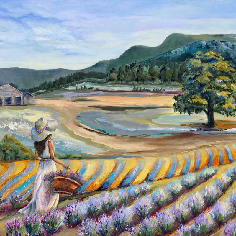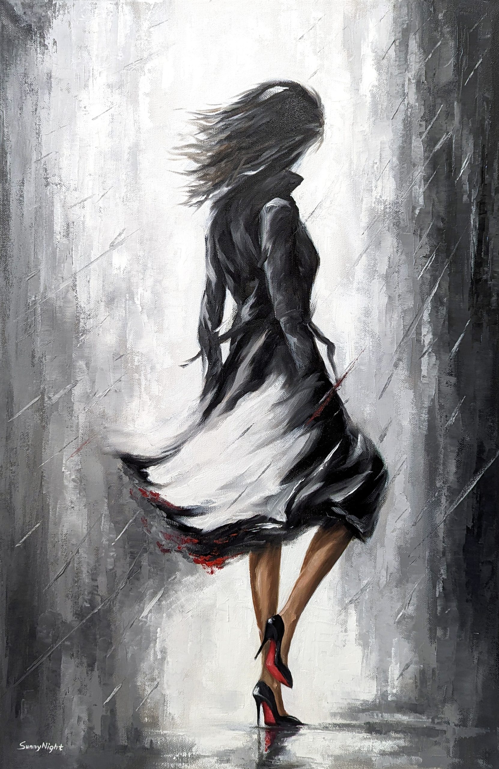 Walking In The Rain 4 by Sunny Night – Impasto oil paint a lady city walk with palette knives & brushes. The canvas is 3.5cm deep, hanging wire installed, edges are painted  Signed on the front.