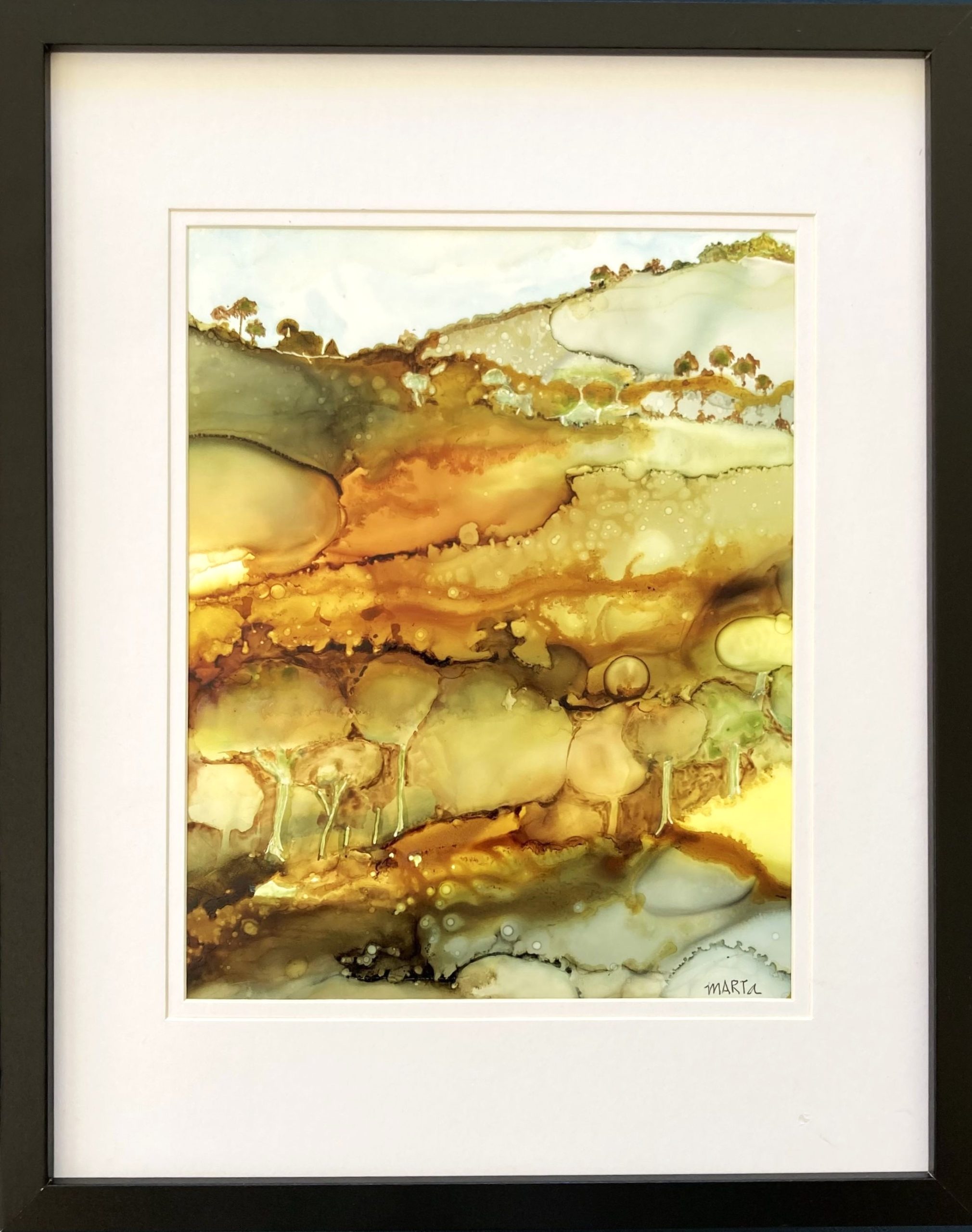 “Walking on Sunshine” by Marta Blaszak invites you into a dreamy, golden landscape bathed in warmth and light. Created with alcohol inks on YUPO paper, the abstract composition captures the feeling of sunlit fields and gentle hills. The fluid textures and glowing earthy tones evoke a sense of calm, nostalgia, and quiet joy.