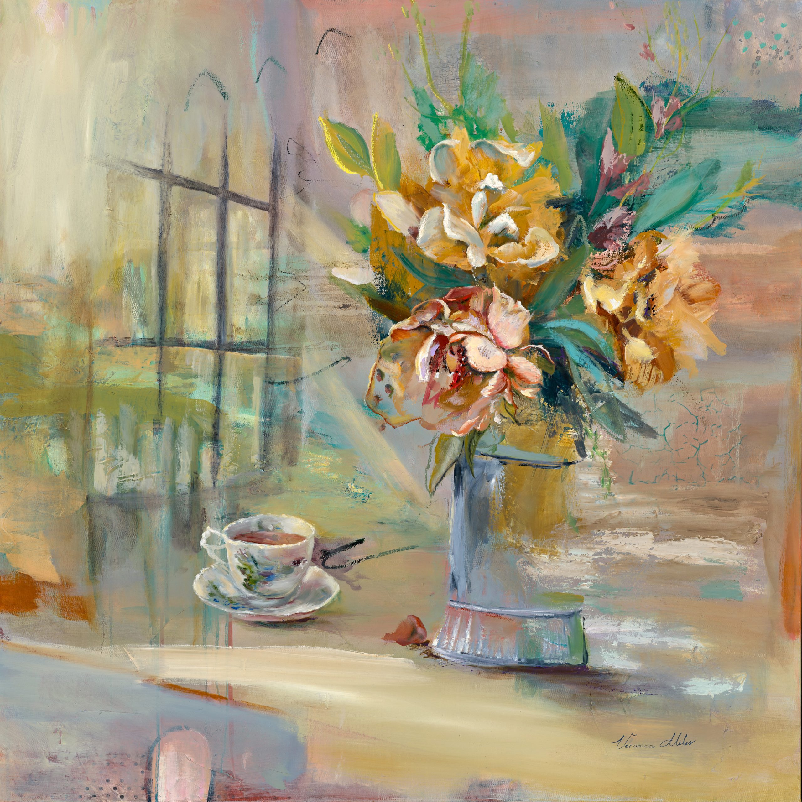 This still-life element, rendered with a touch of abstraction, signifies the transient nature of memories as the vase seems to merge into the background. The presence of a teacup invites the viewer into a moment of reflection and meditation, while the depiction of a glass window hints at a yearning for the future.
