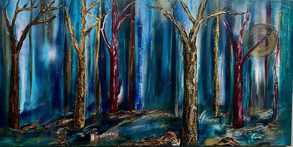 Wandering Through is a moment captured where whimsical forest energy leaves impressions on our mind. It’s layers create a deep and varied texture, and contains metallic copper and bronze paint that changes in the light of the day much like a real forest does.