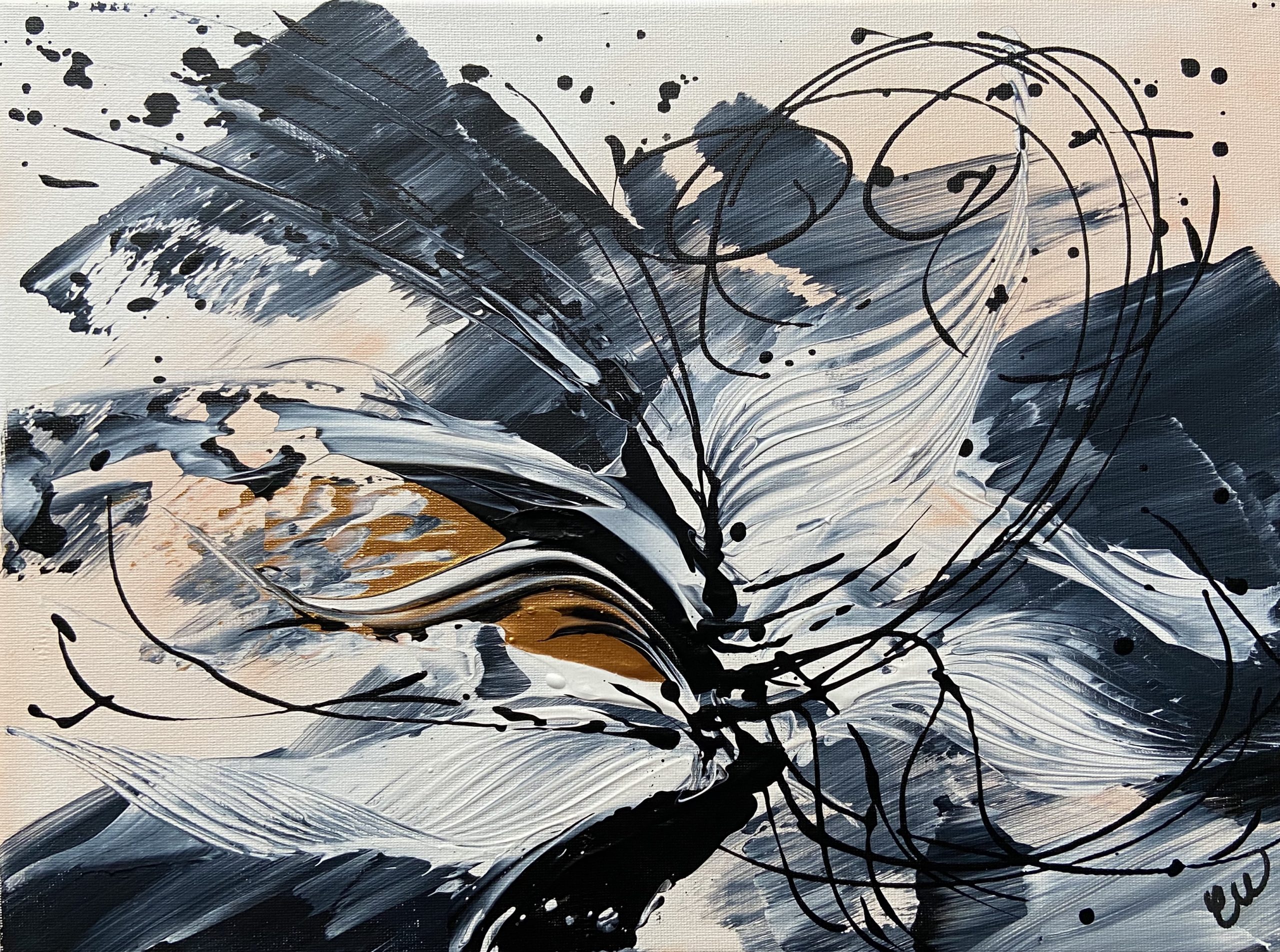 Wanderlust by Carrie Welsh is a beautiful abstract piece with lots of contrast in colour and captured movement. It has a whimsical and luxe feel. The peach hue is gorgeous and the gold gives this piece that extra component of wow. Wanderlust will add life to any walls! 30 x 40cm. Acrylic on canvas, ready to hang.