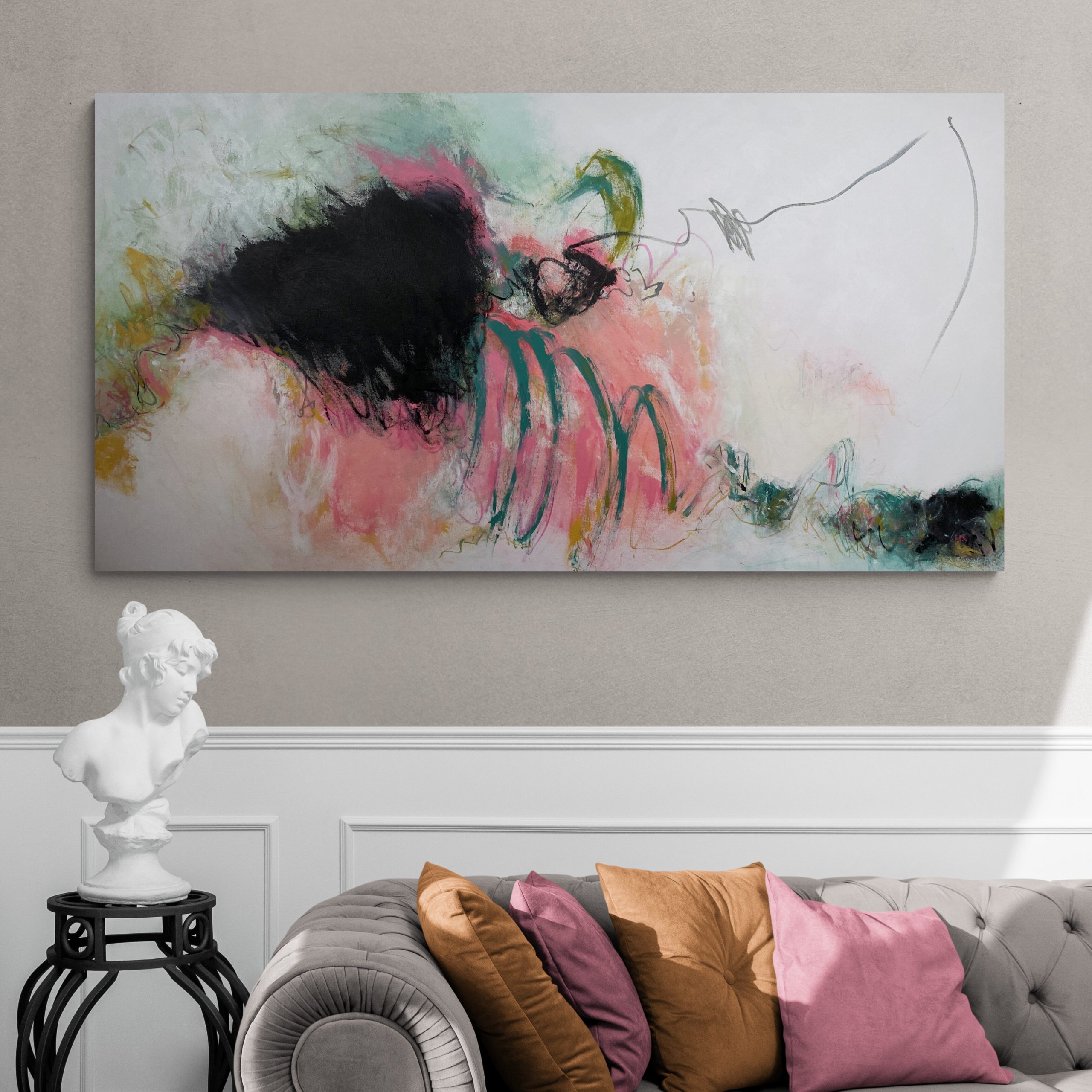 Wanderlust is an original painting by Cheryl Harrison. It’s expressionist mark making combined with its vibrant palette of green, pink and black, married with warm ochre tones is the perfect statement piece for a large space.